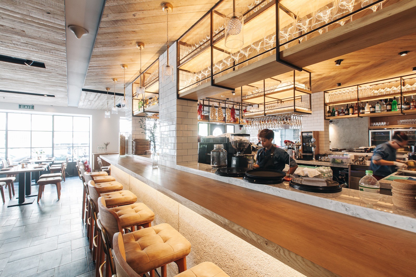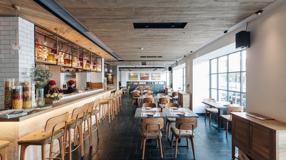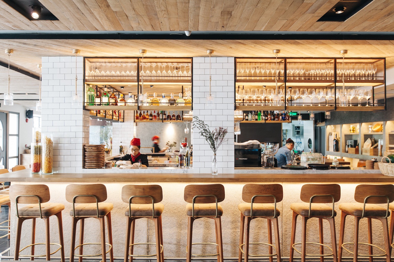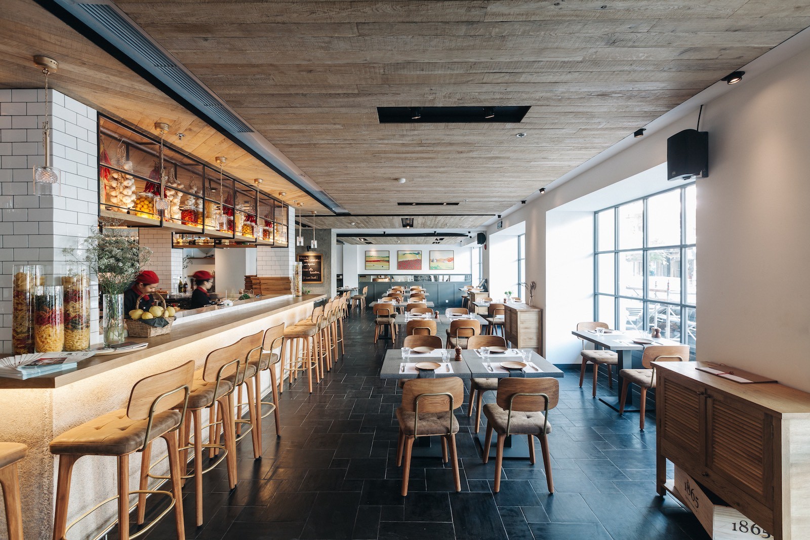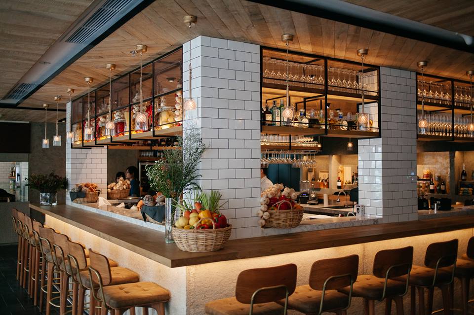 Design Traditional wood-framed windows overlook the bustle of Pasteur Street, while the earth tones and timber-panelled ceilings of the restaurant interior evoke the character of Tuscan dining. The central Mercato bar and open kitchen dominate the interior, while spacious table settings on the charcoal tiled dining room floor space enhance the elegant dining atmosphere.