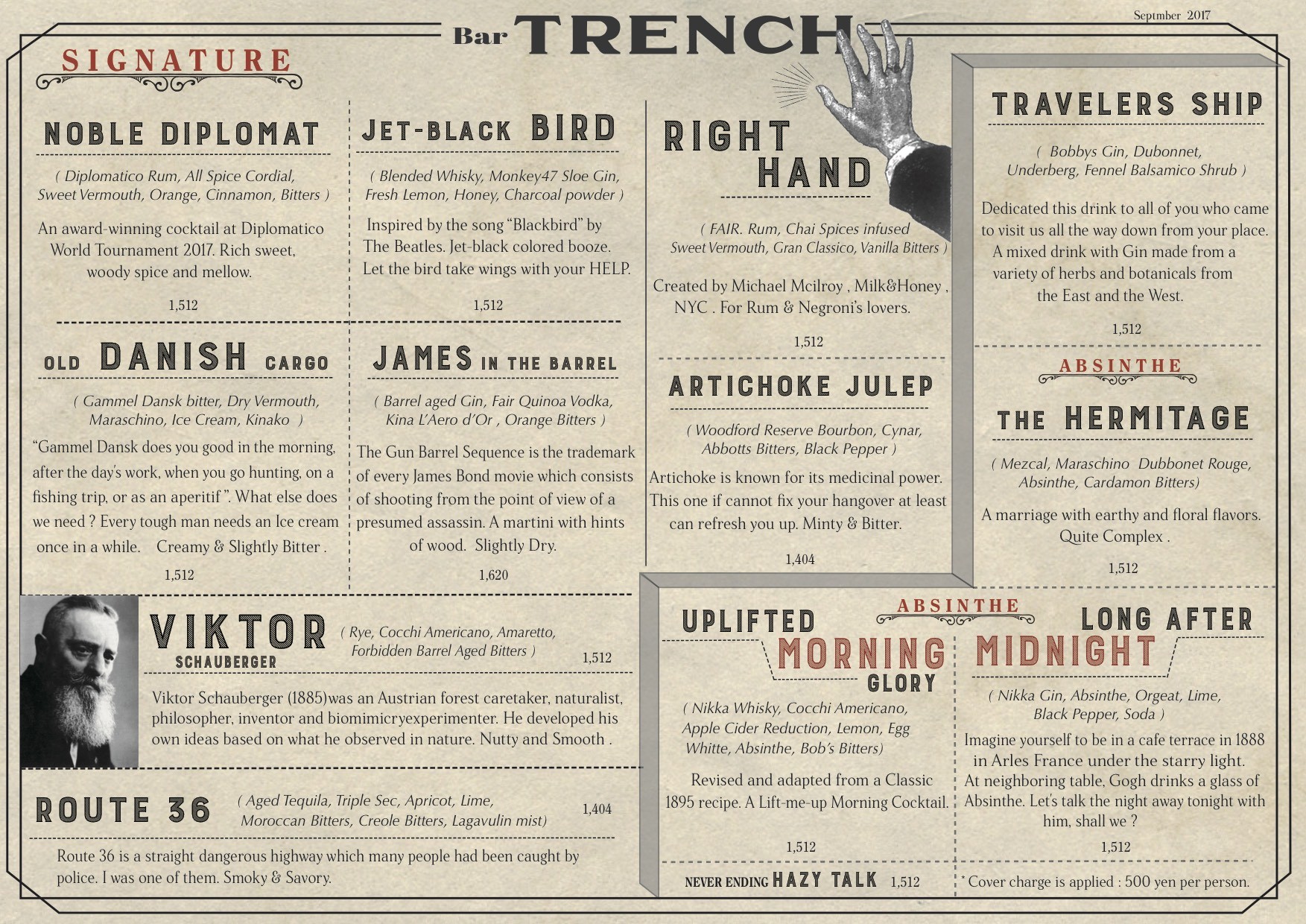 Dapper head bartender, Brazilian-Japanese Rogerio Igarashi has put together a compilation of intriguing cocktails that includes vintage libations, modern classics and Bar TRENCH signatures. With an impressive back bar replete with bottles of fine spirits, absinthes, rare herbal liqueurs, and Japan’s largest selection of bitters – the bartenders reward guests with drinks like the signature Artichoke Julep – made with Woodford Reserve Bourbon, Cynar, Abbotts Bitters and black pepper; and the absinthe-inflected Uplifted Morning Glory – with Nikka Whisky, Cocchi Americano, apple cider reduction, lemon, egg white, absinthe and Bob’s Bitters. In addition to the regular cocktail list, Bar TRENCH also offers seasonal speciality creations with well-priced drinks to please all tastes.