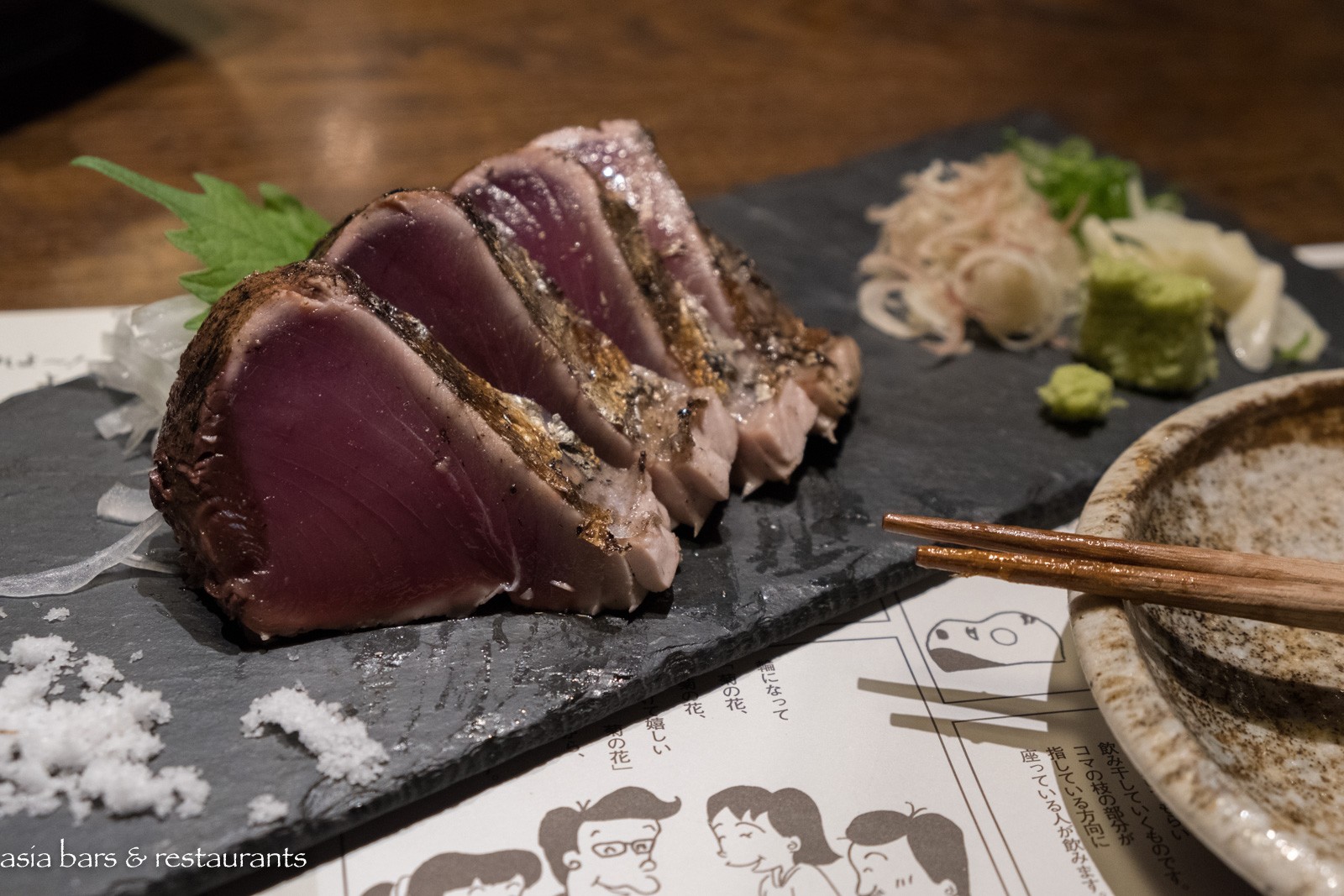 Menu highlights include the signature steaks of seared bonito – seasoned with sea salt and served with wasabi and garlic. Other specialties include straw-roasted chicken and other meats, seared mackerel and vegetables. Dishes and drinks are attractively priced compared to more fashionable Roppongi restaurants.