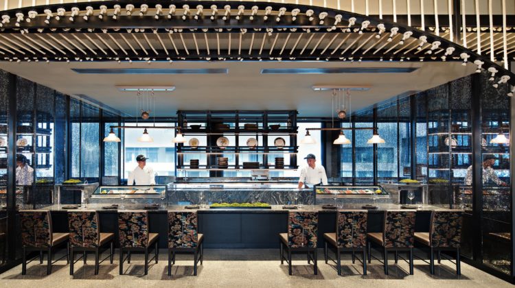 Standing on a street corner, the spacious all-timber construction references a traditional Japanese aesthetic- while sliding full-height glass doors across the facade open the restaurant interior out onto the pavement. Several private and semi-private dining spaces are good for small groups and banquets – with the main counter seating around 12 guests.