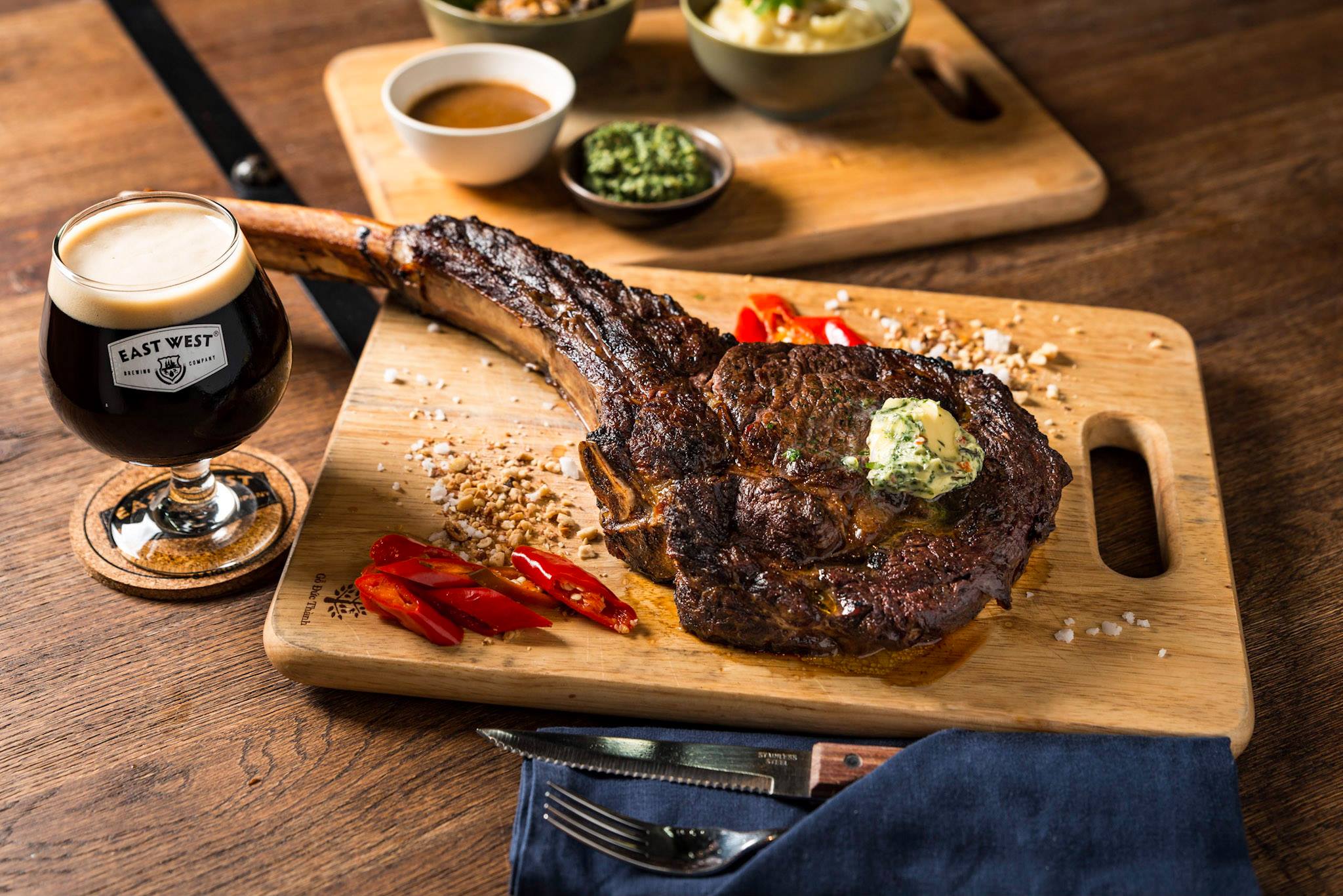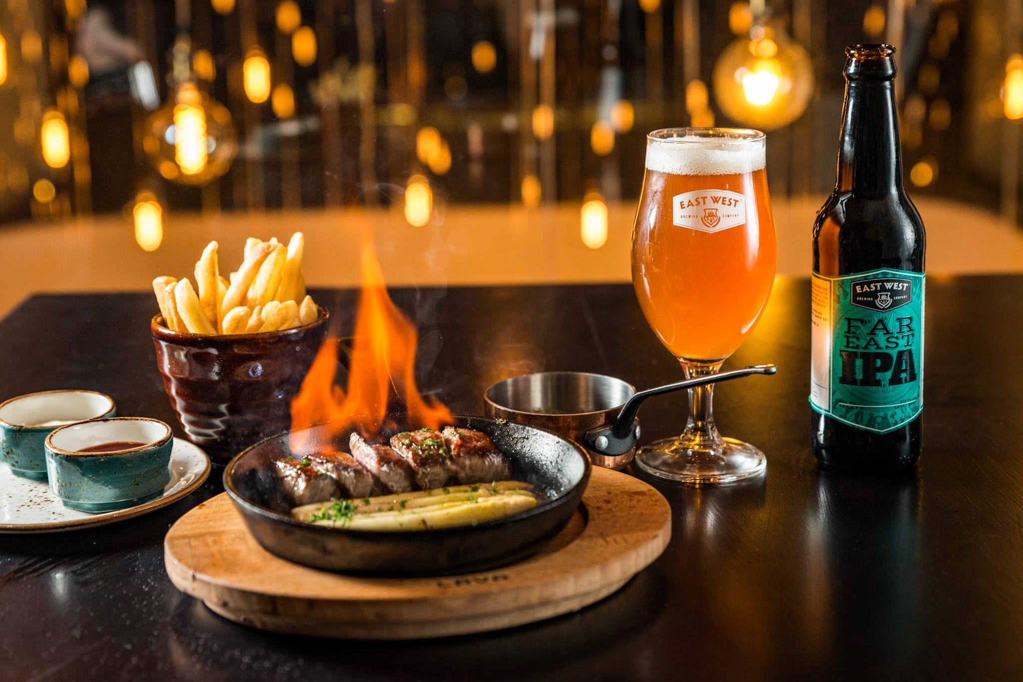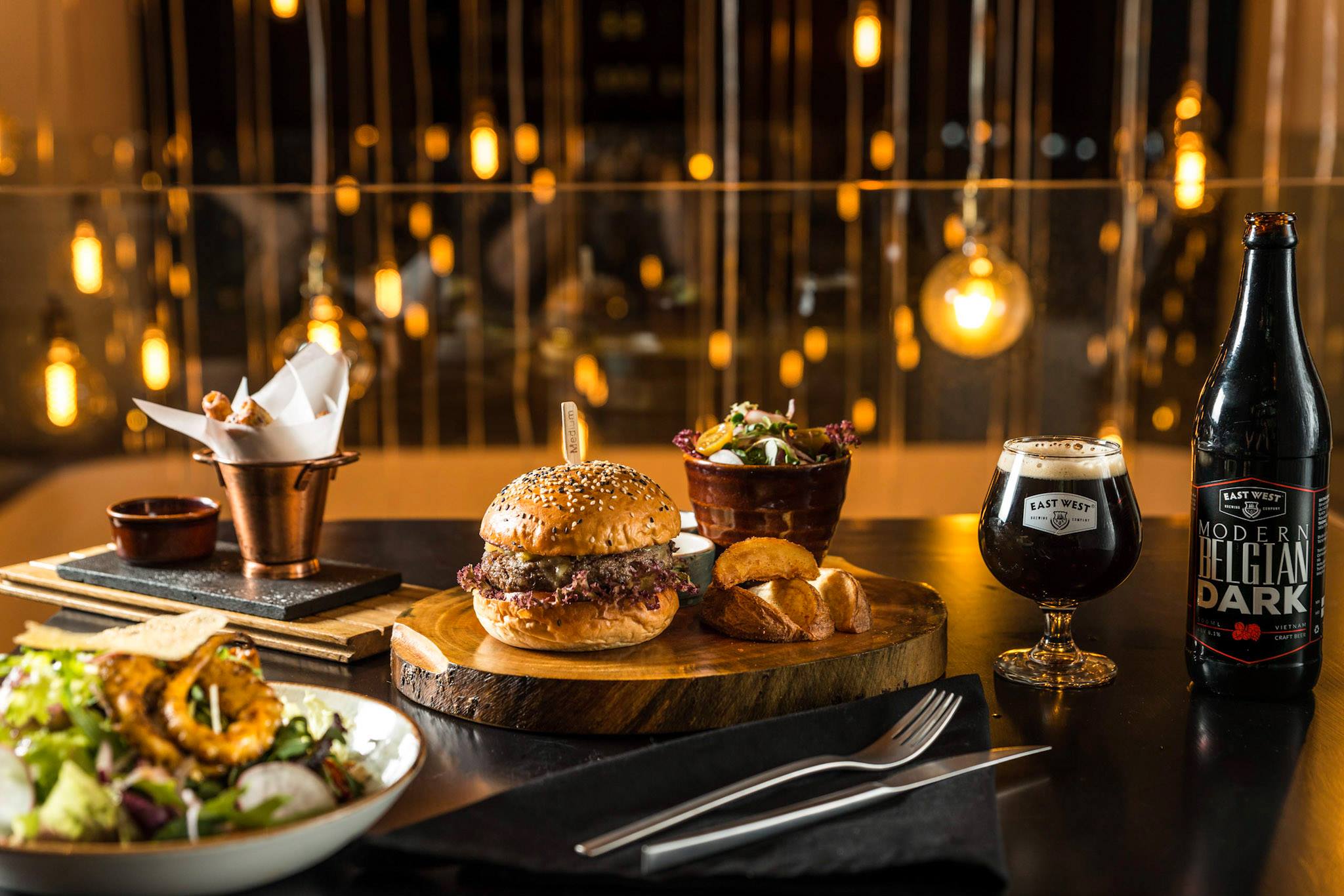 Taking further cues from the USA, East West combines premium craft beer with upscale yet casual dining. Under the direction of experienced American chef Matthew Venzke, the cuisine is notable for its bold flavours and meld of classic Western dishes with local Asian flavors. Designed to pair with the craft beers, the menu offers selections of small Bites; Sharing Platters for groups – try the West Appy Platter – a plateful of barbecue wings, chicken quesadillas, salmon tartine and soft pretzels; Burgers & Sandwiches; plus Appetizers and Mains. Stand out dishes include the Tasmanian Tomahawk Steak, Iberico Ham, and Duck Confit.