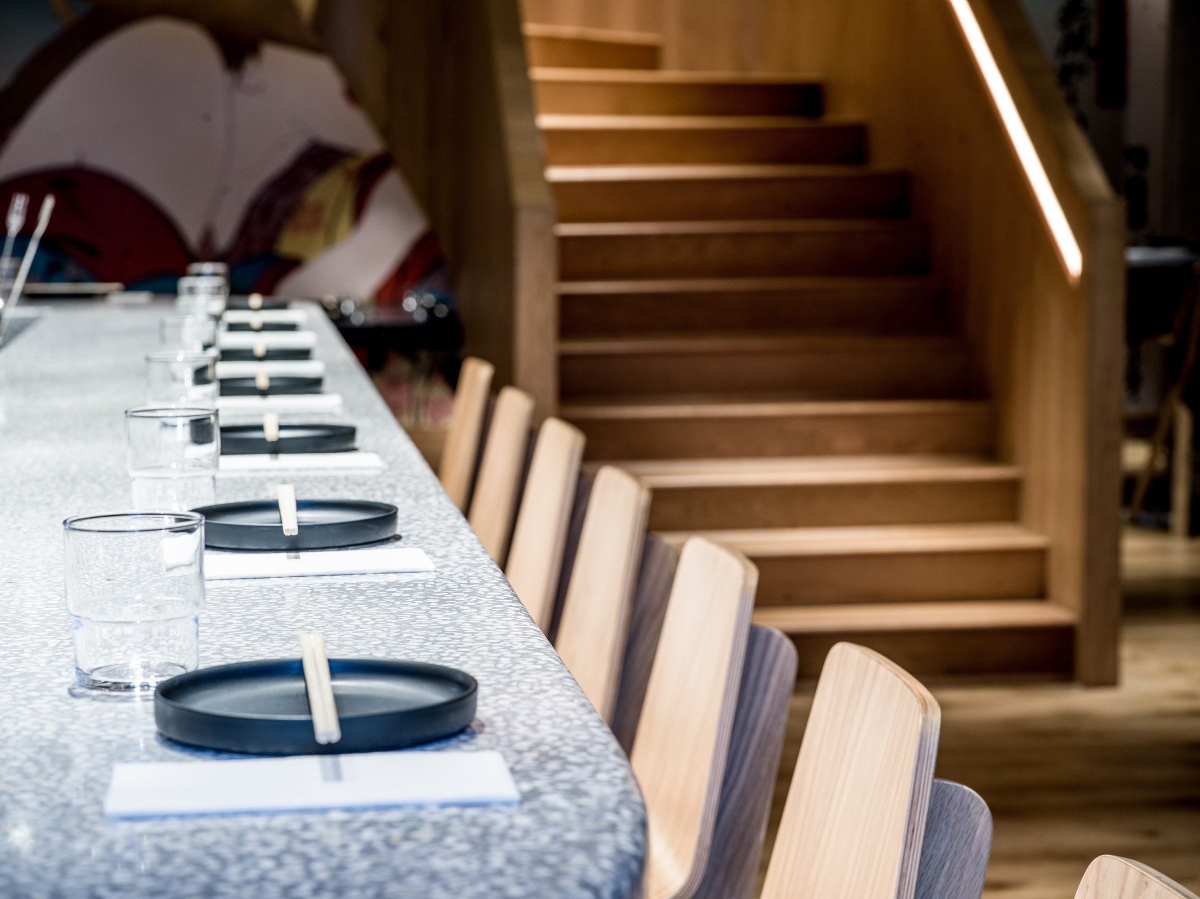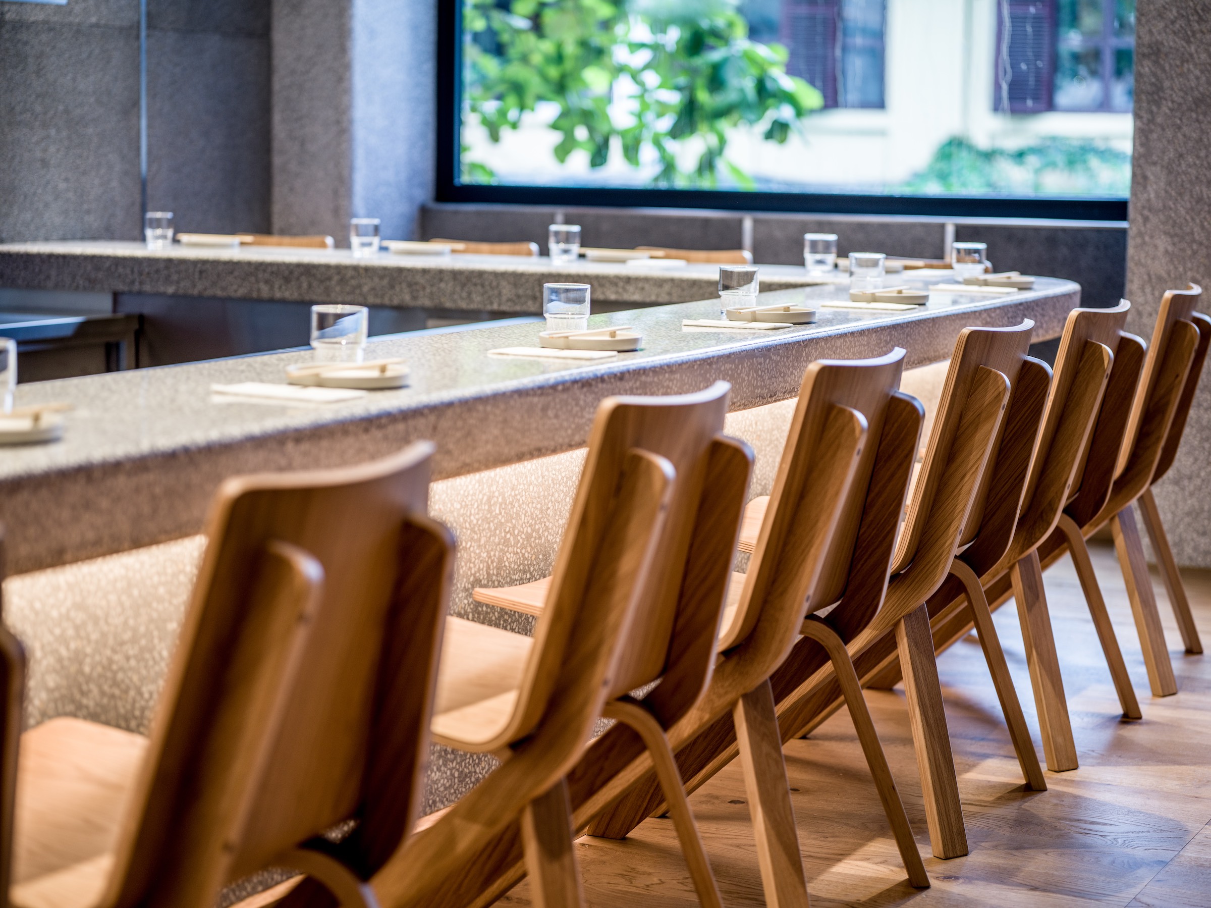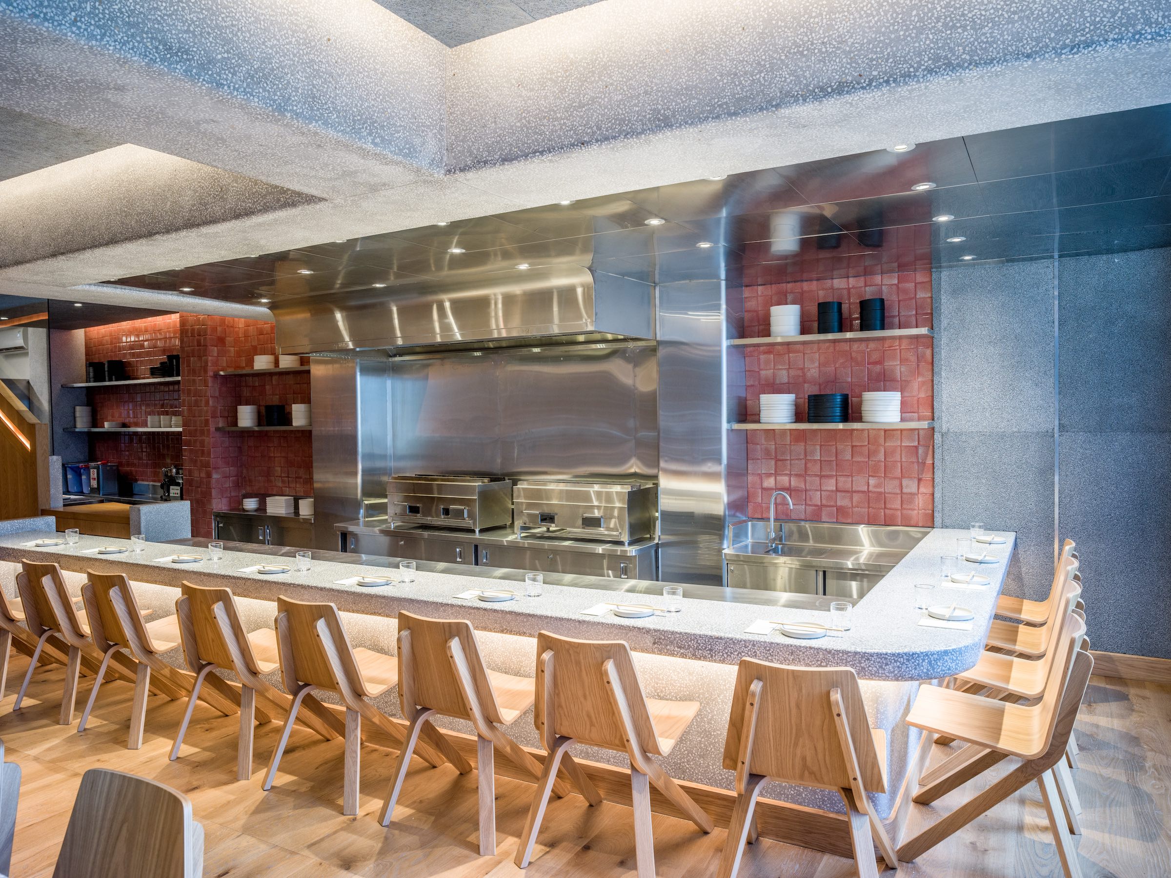 With an impressive portfolio of restaurant design projects that includes Sake Central (Hong Kong and Saigon) and Hong Kong’s Ho Lee Fook and Yardbird, designer-architect Sean Dix adopts a minimalist aesthetic at Renkon with a restrained palette of natural tones expressed with blond wood furniture and raw concrete surfaces, while an Ukiyo-e style mural splashed across the back wall adds a dramatic and colorful highlight. Set across two levels, the upper floor simmers with the scents of the open Japanese binchotan charcoal grill – fronted by the solid terrazzo dining counter. The Renkon culinary team serve up appetizing izakaya dishes exemplified by the Chicken Thigh Skewers coated with house-made shichimi and a splash of lemon, and Pork Meatballs served with egg yolk and tare.