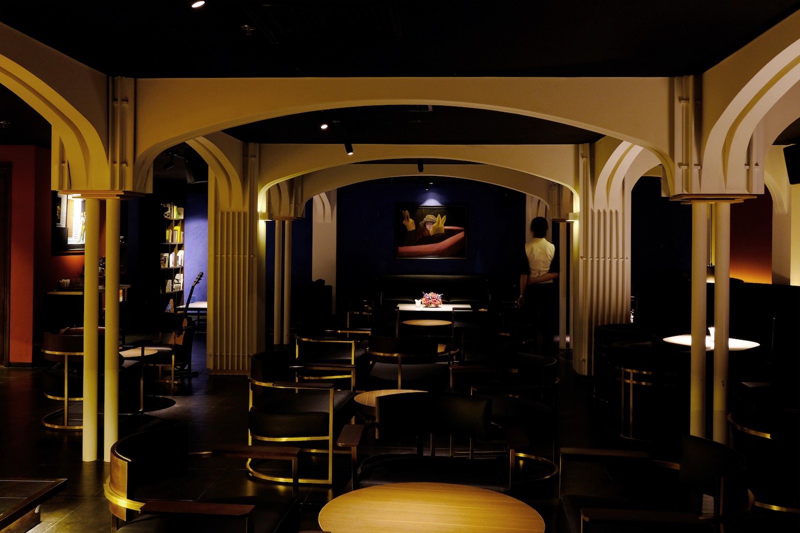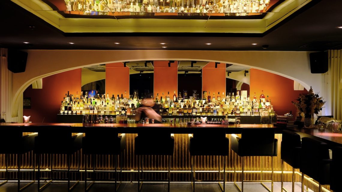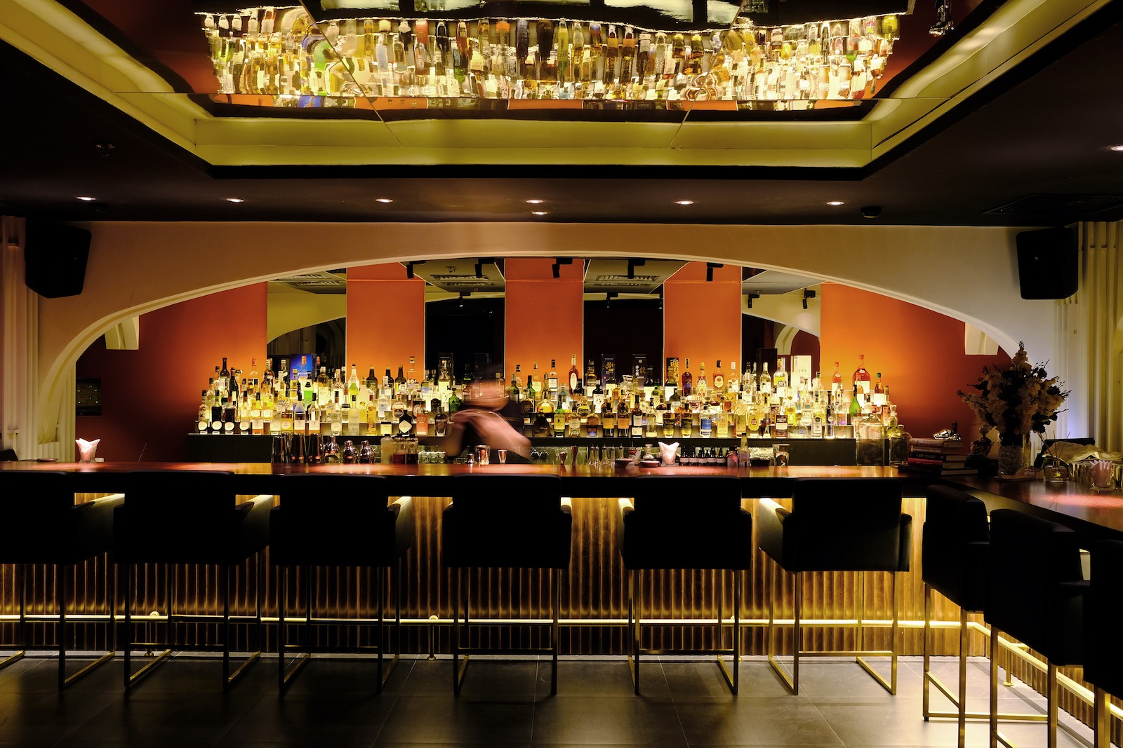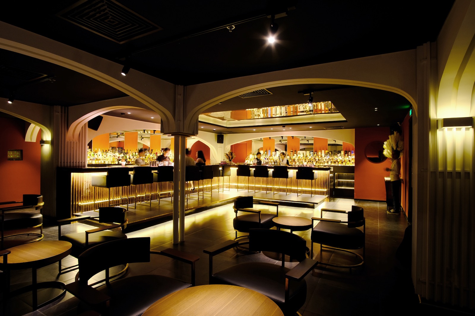 Behind the dark velvet curtained entrance, design elements such as the impressive “L” shaped bar counter, mirrored back-bar, restrained decor palette and dim lighting evoke the speakeasy vibe. Extending beyond the raised platform of the bar, the lounge space features groupings of low tables, mid-century style armchairs and plush banquettes.