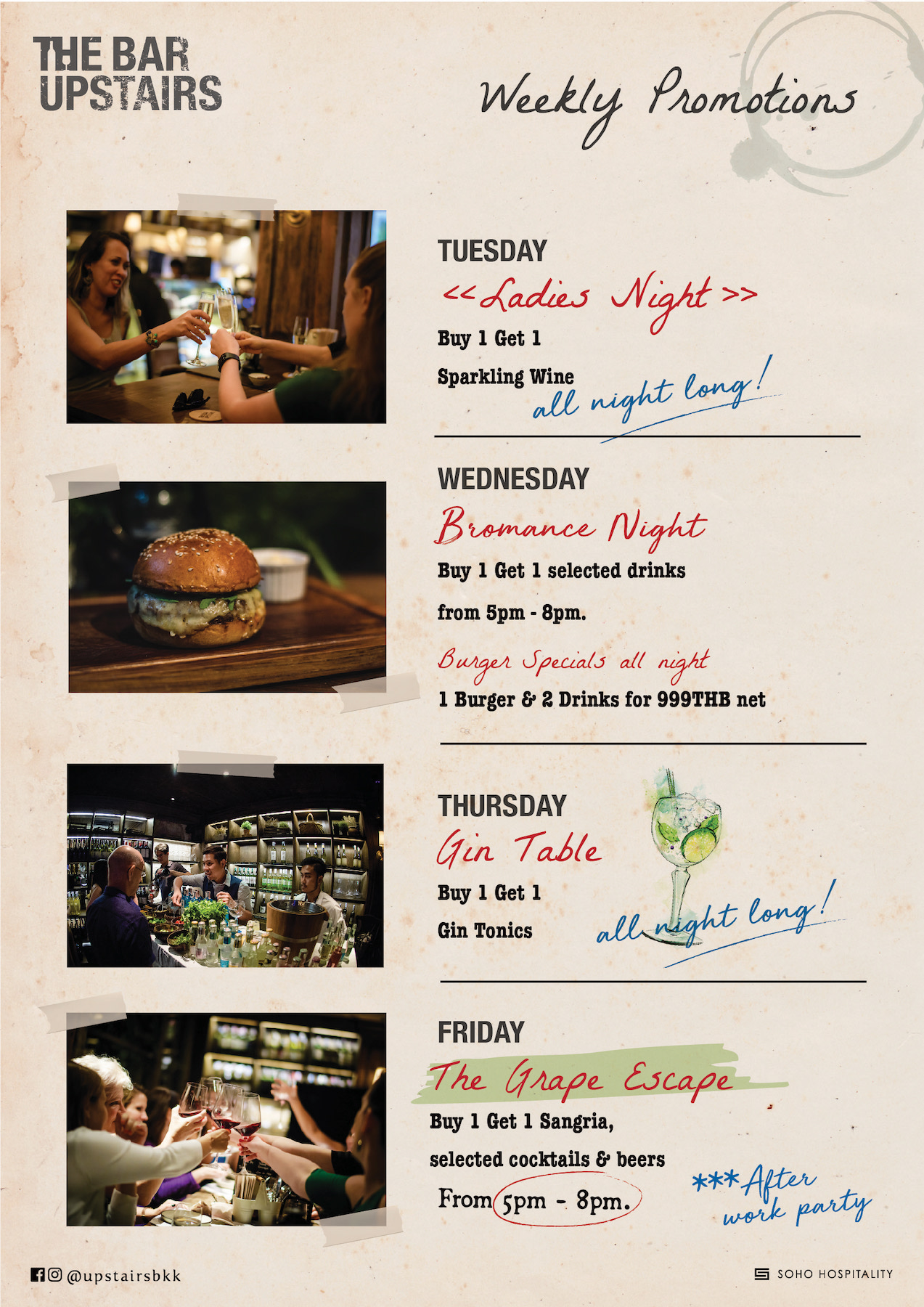The Bar Upstairs opens daily from 5 pm – with late closing on Friday and Saturday nights. Weekly themed promotion nights offer attractive deals.