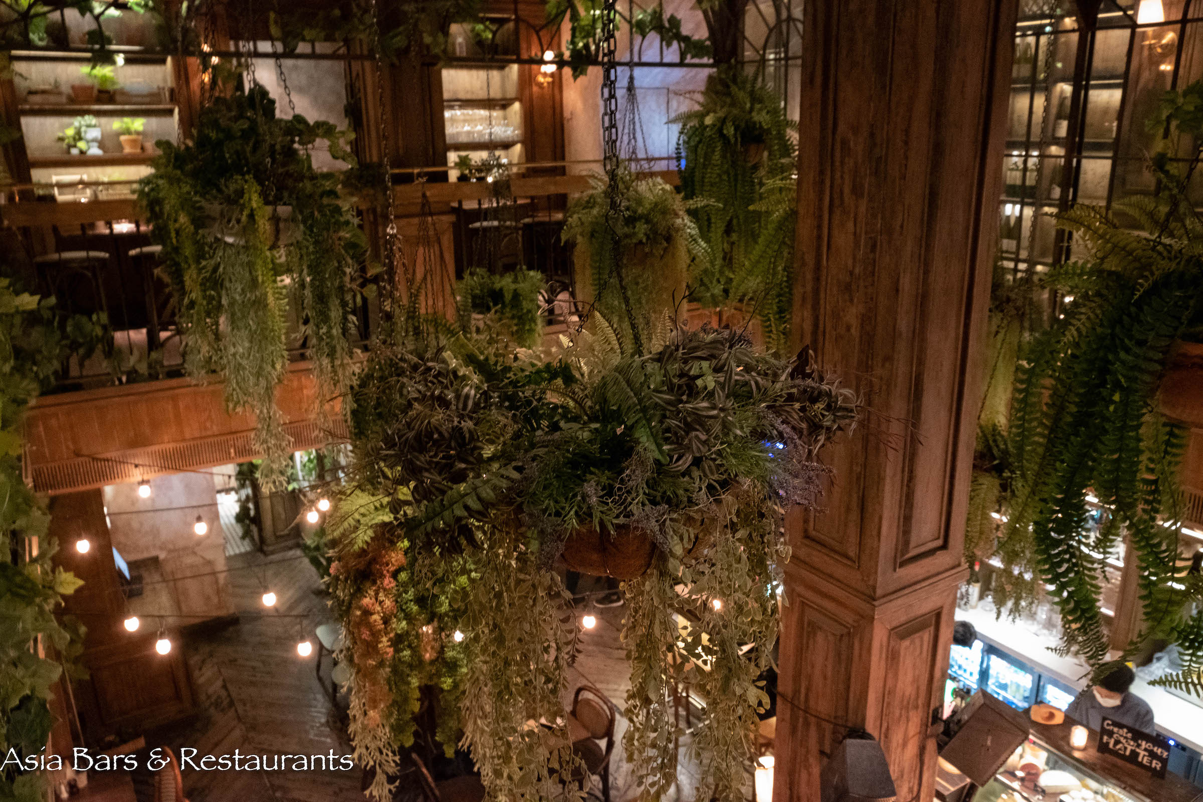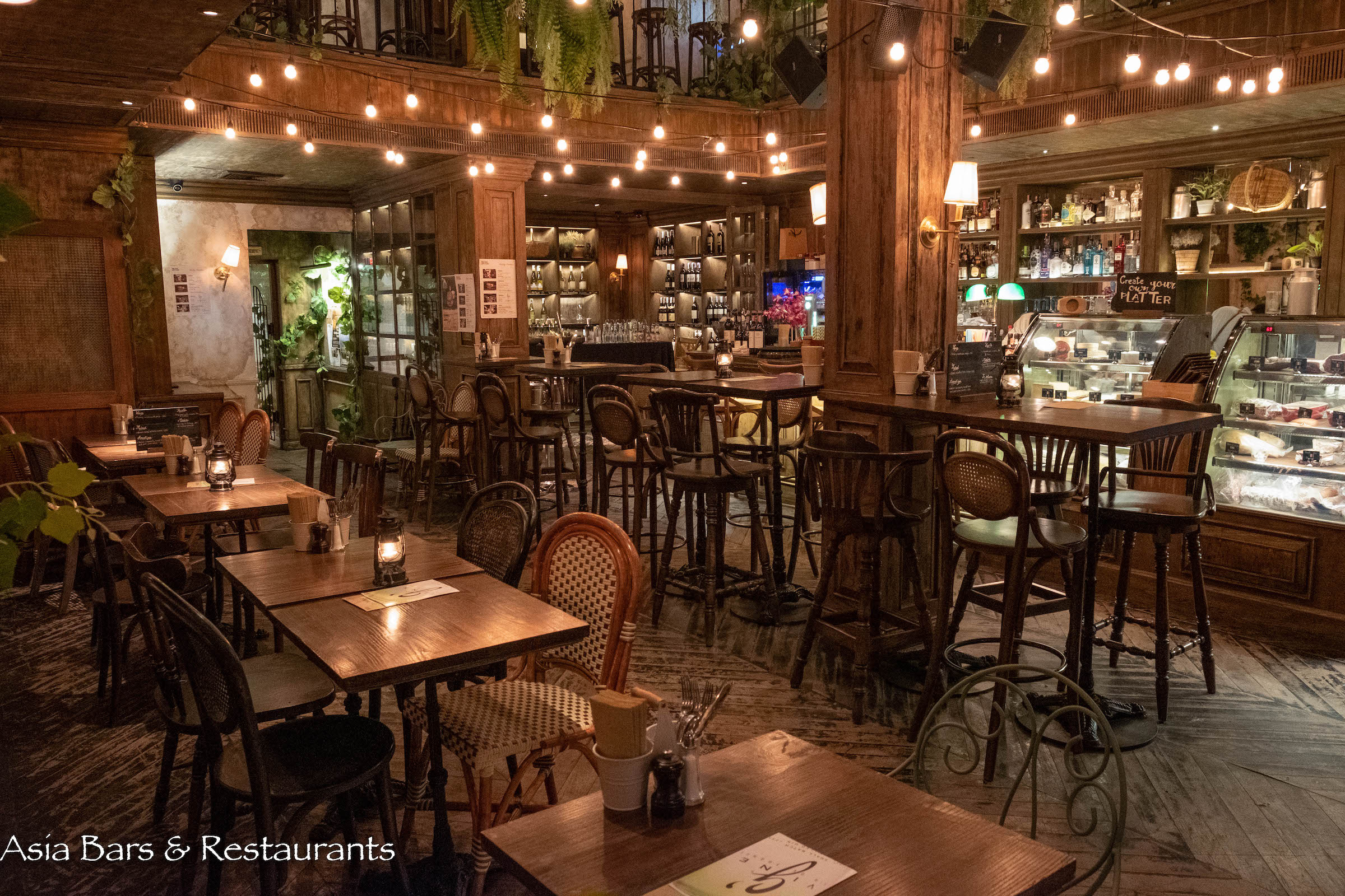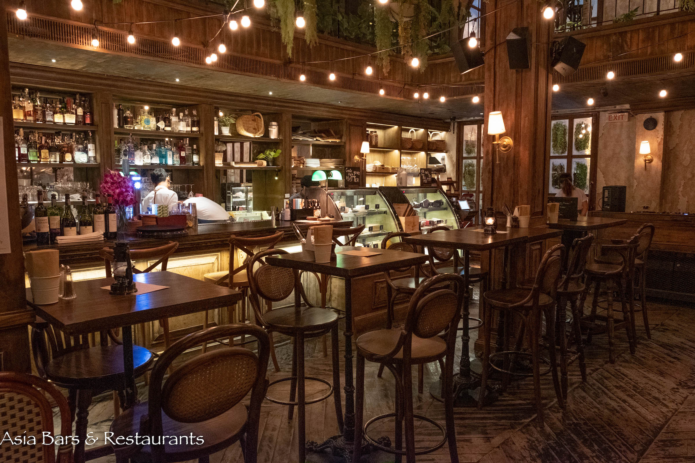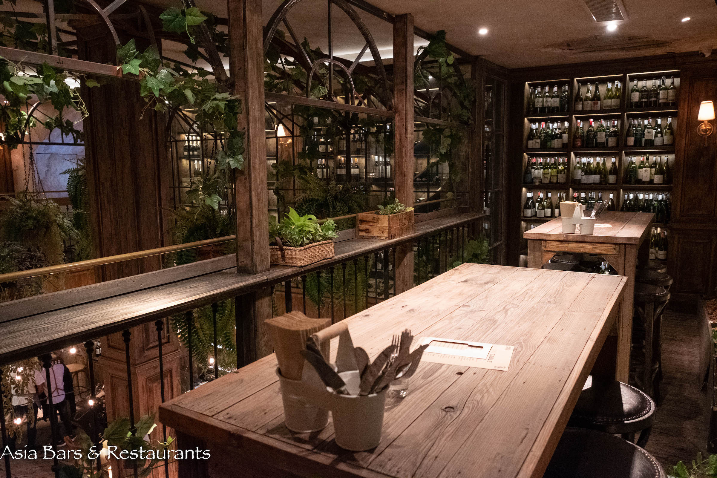 Stylish yet unpretentious, The Bar Upstairs is a charismatic addition to Bangkok’s wine bar scene – located upstairs from the popular French restaurant Brasserie Cordonnier. A recently launched concept by the respected Soho Hospitality group (see also Soi 11 stalwarts Above Eleven and Charcoal Tandoor Grill), The Bar Upstairs offers an impressive cellar stocked with premium wines sourced from leading global winemakers – giving patrons the option of buying bottles for takeout – or enjoying the wines and classic French snacks (see snack list) in the spacious double-height lounge space created around the theme of an abandoned provincial farmhouse – the timber interior and furnishings overgrown with lush greenery.