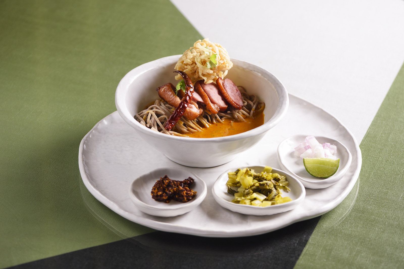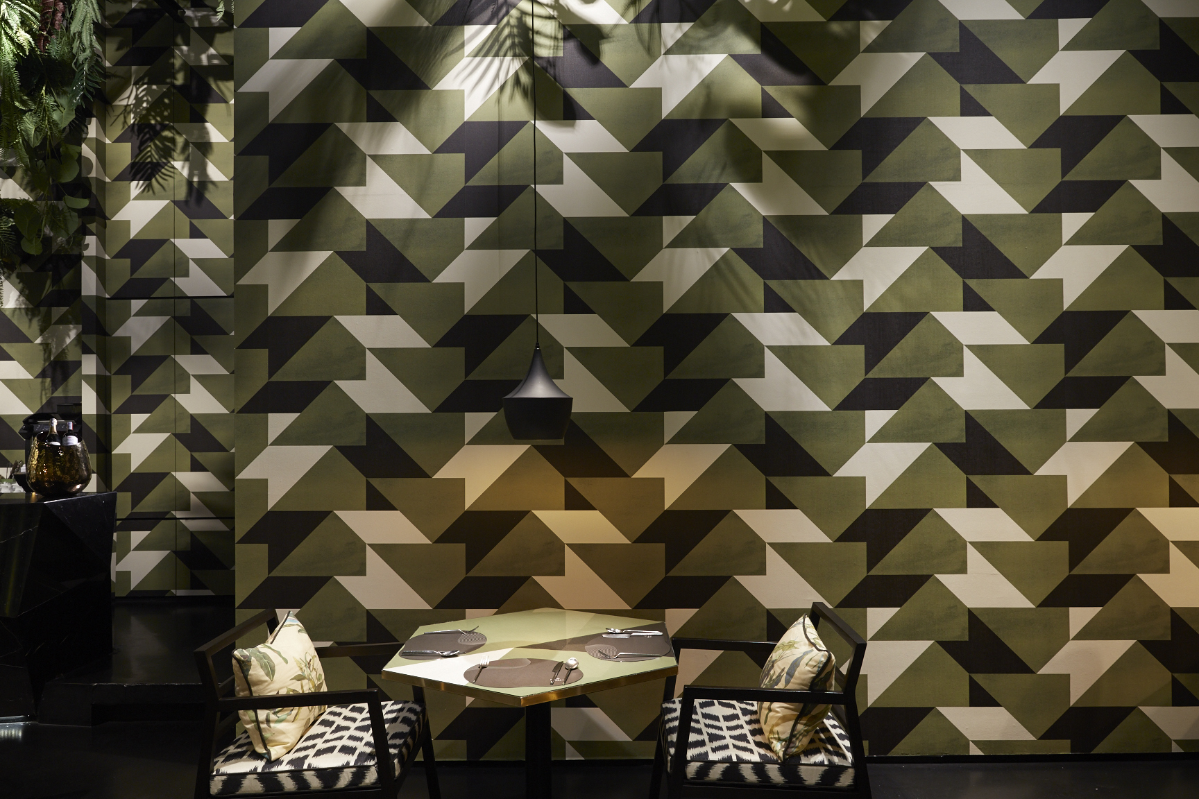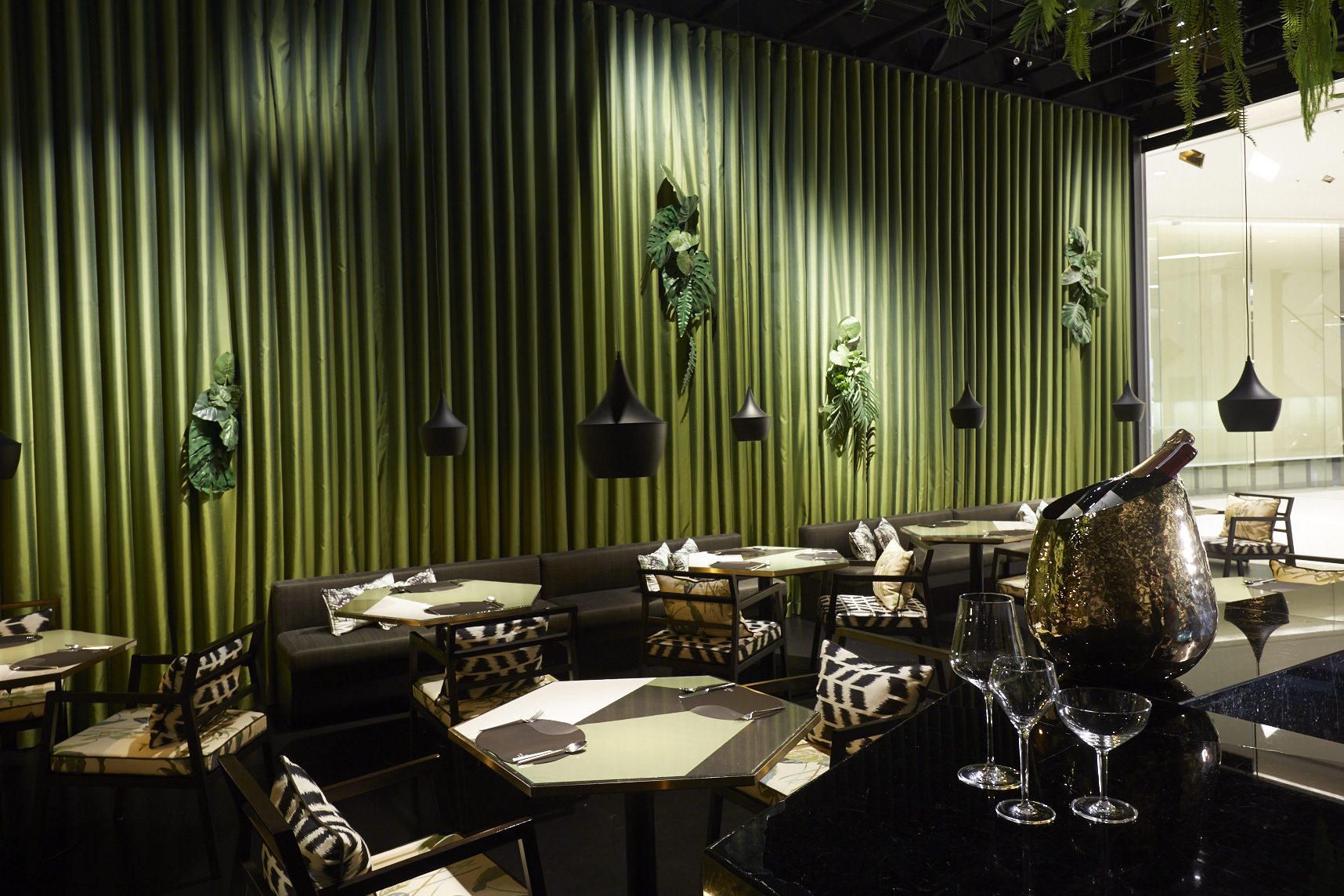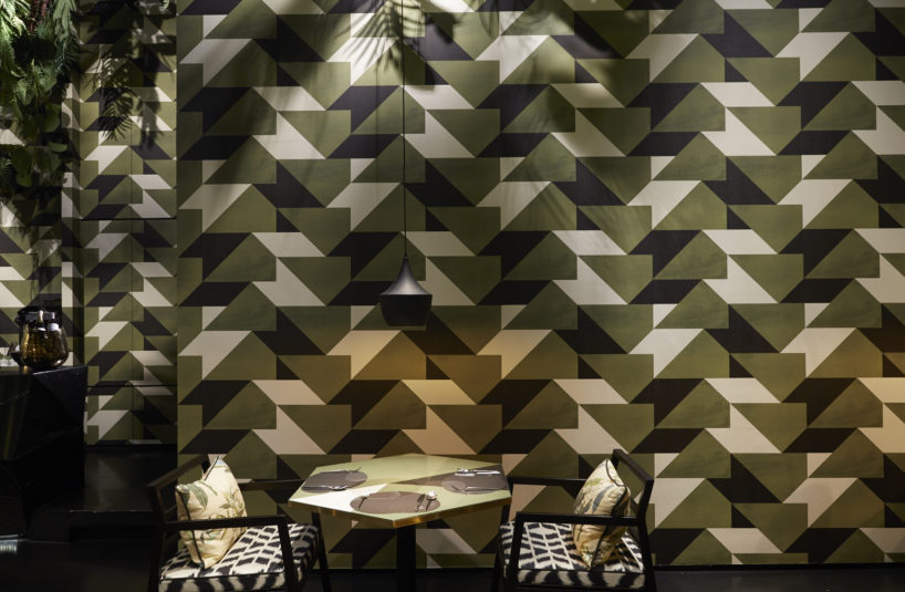 Located within Bangkok’s prestigious, upscale Siam Paragon shopping centre, Bombyx occupies a compact space exquisitely decorated with earth tones of greens and brown, with green leaves spring out from the ceiling and green iridescent silk wall. Seating options include banquettes and hexagonal-shaped table settings with bold geometric patterned furnishings, while contemporary art installations connect Thai culture and cuisine.