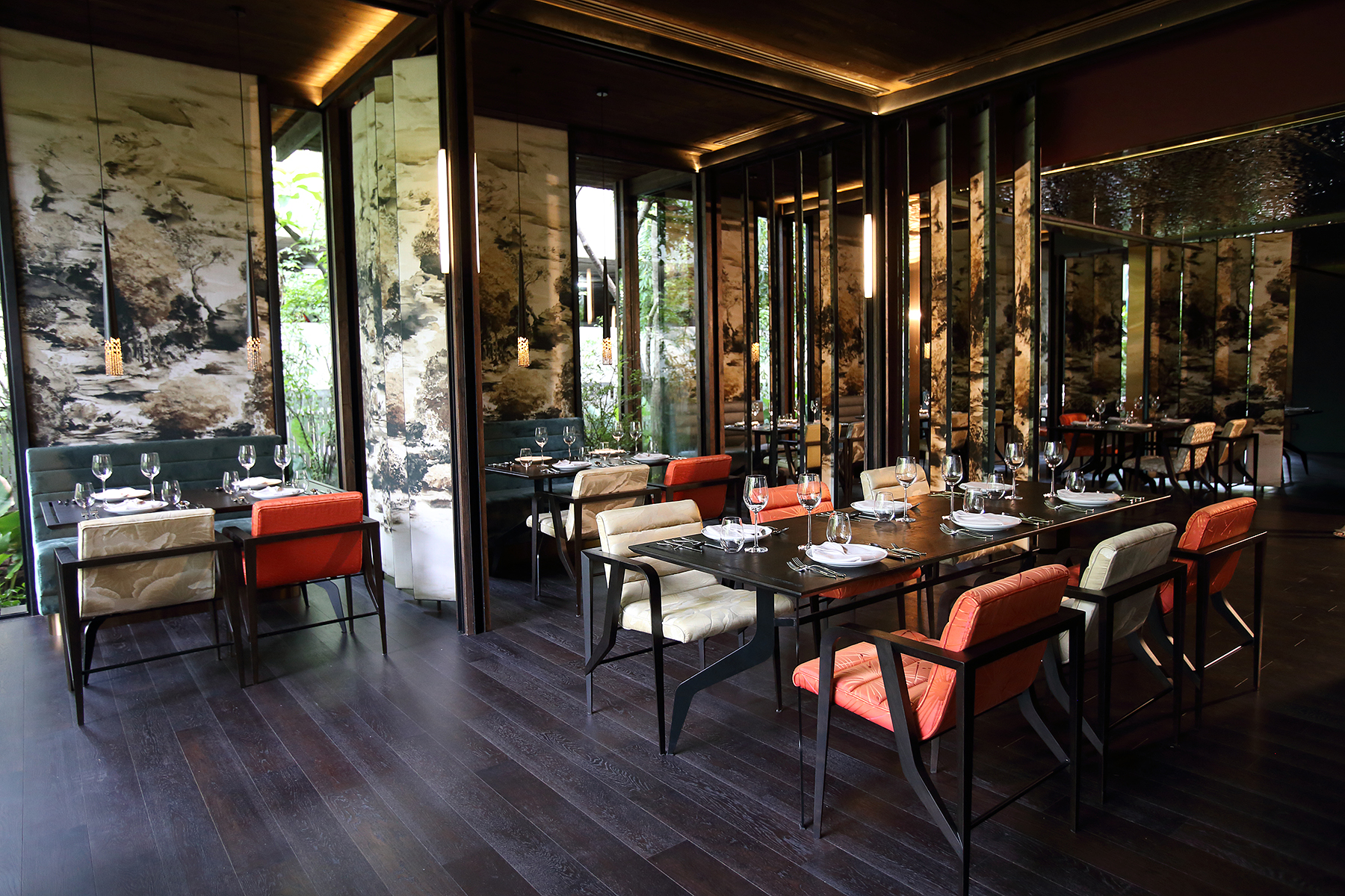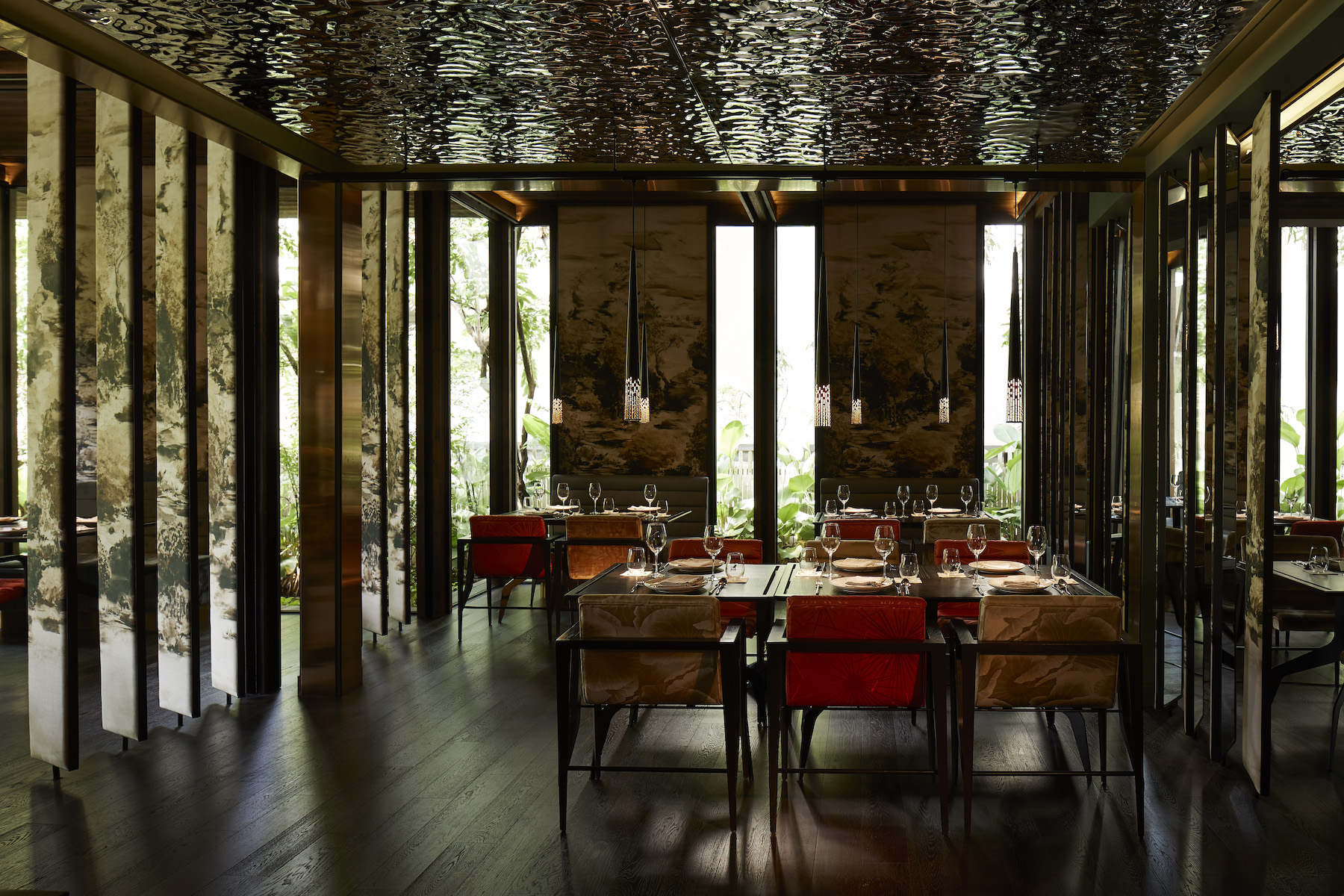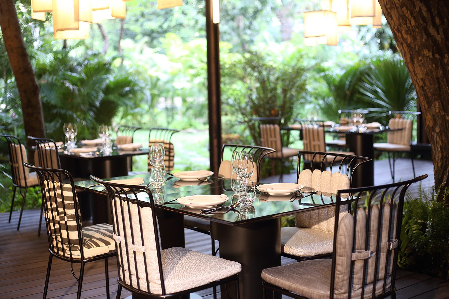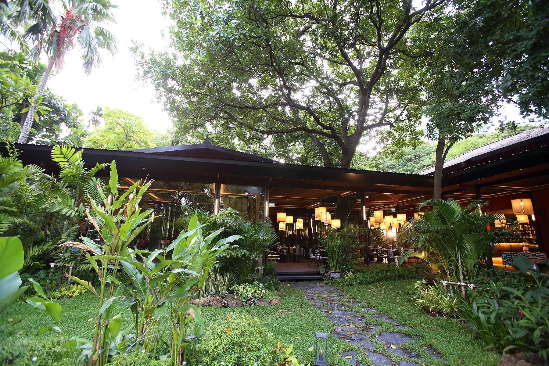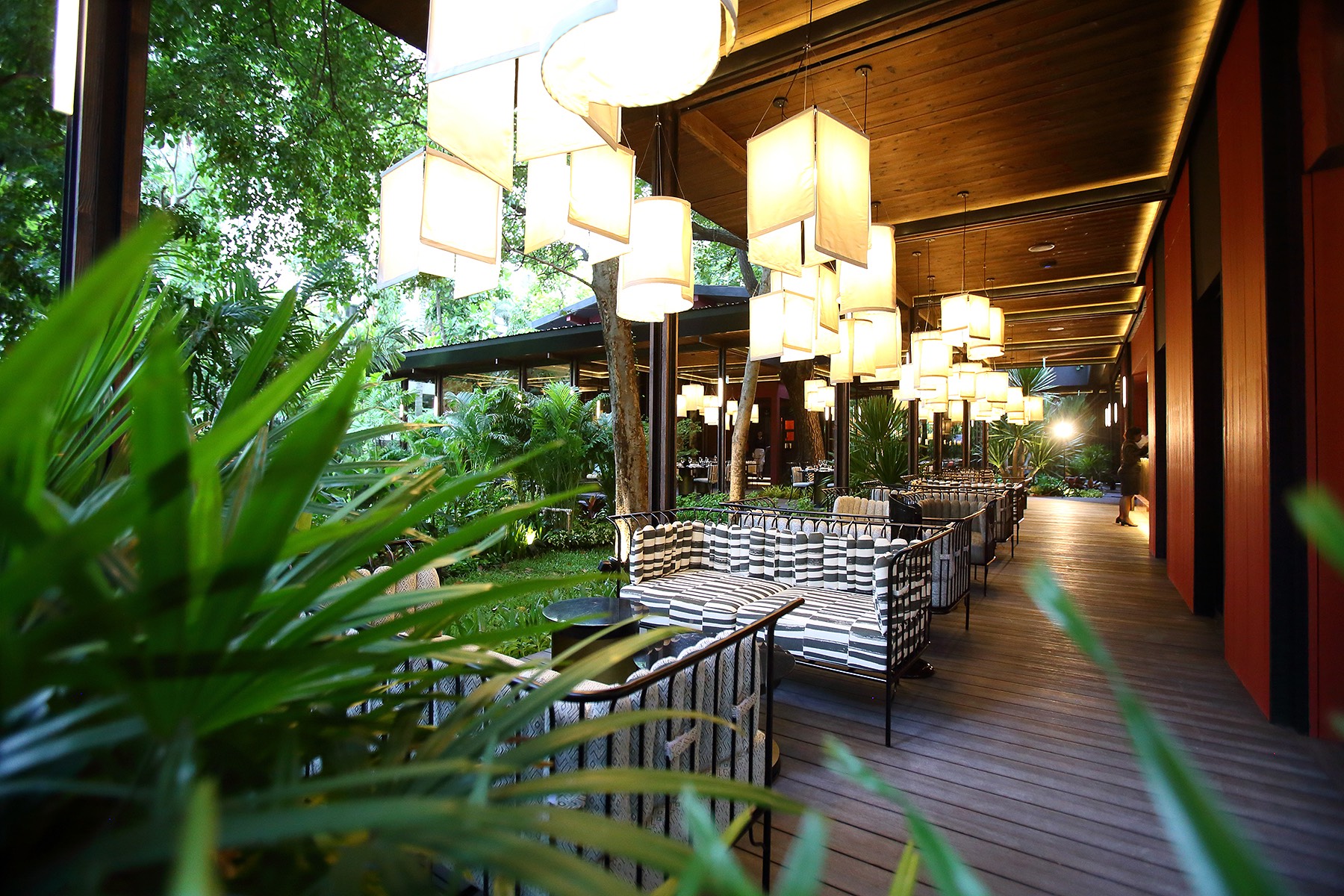 Enlisting the services of architectural and design firm Boiffils Studio, two residential bungalows in central Bangkok has been transformed into an urban oasis of sophisticated dining and relaxed hospitality. Surrounded by an expansive green garden and lush tropical plants, the main dining room enjoys a garden outlook through floor-to-ceiling glass windows, while silk-covered pivoting dividers can create more intimate private spaces. Traditional Thai furnishings – with a contemporary aesthetic – were inspired by the original Jim Thompson House – complementing the tropical hardwood timber flooring and furniture. Adjoining the main restaurant, a covered timber deck patio accommodates outdoor table settings and bar area for casual dining and drinks experiences.
