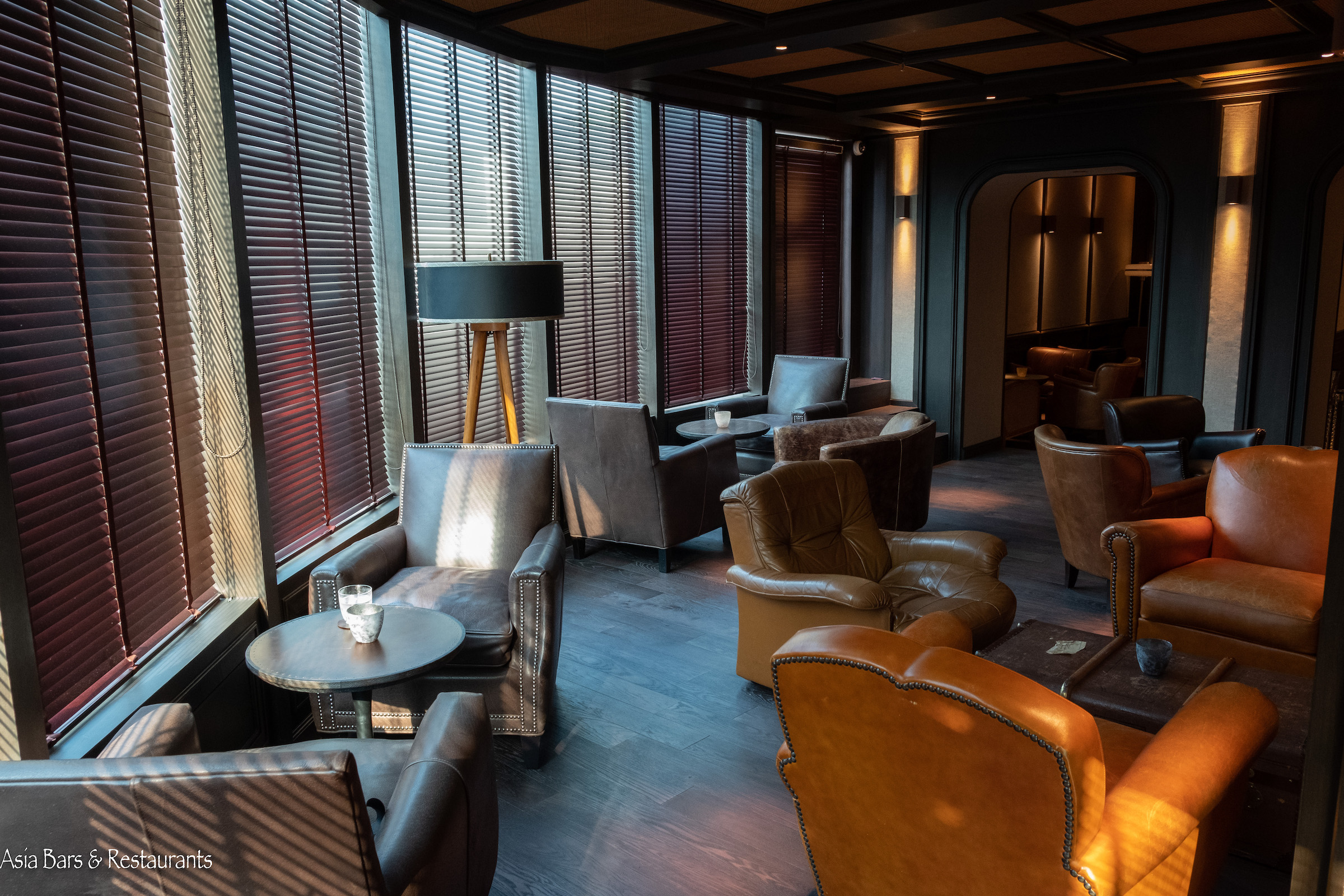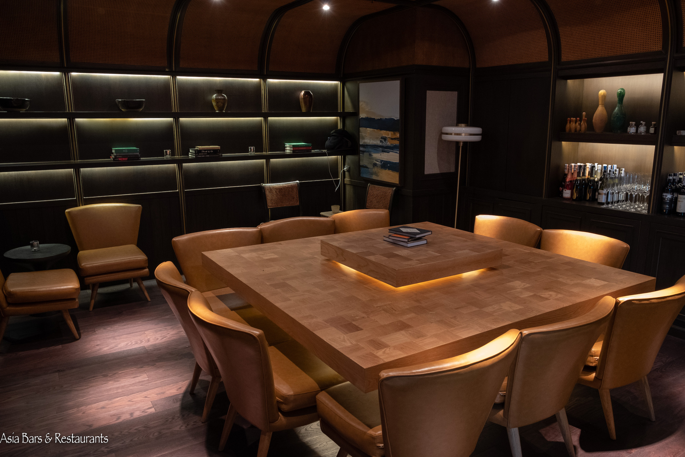 Interior 008 Bar can be found behind an unmarked solid timber doorway at the end of the outdoor terrace on the 11th floor of the hotel. The corner space projects a relaxed sophistication with its blond timber bar counter matched with plush tan leather bar seats. Retro-style leather armchairs are clustered around low tables across the main floor space, while a semi-private space adjacent to the main bar features a large square communal table.