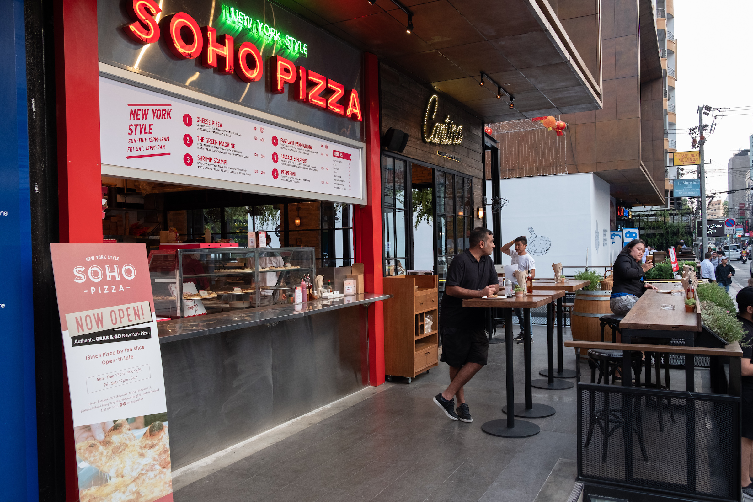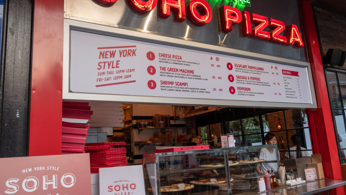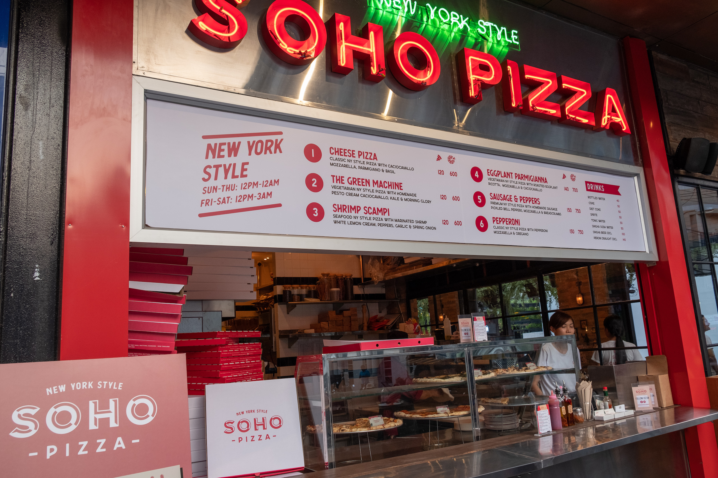With the recent opening of Soho Pizza in Bangkok, the concept of New York style grab-and-go pizza slices has been introduced to the city’s vibrant dining and nightlife scene. Located within a street frontage space of the new Eleven Bangkok lifestyle mall – in the heart of the Sukhumvit Soi 11 entertainment strip – Soho Pizza serves a selection of freshly cooked pizza slices (or whole 18-inch pies) for either take out (and home delivery) – or eating at the open-air street counter.