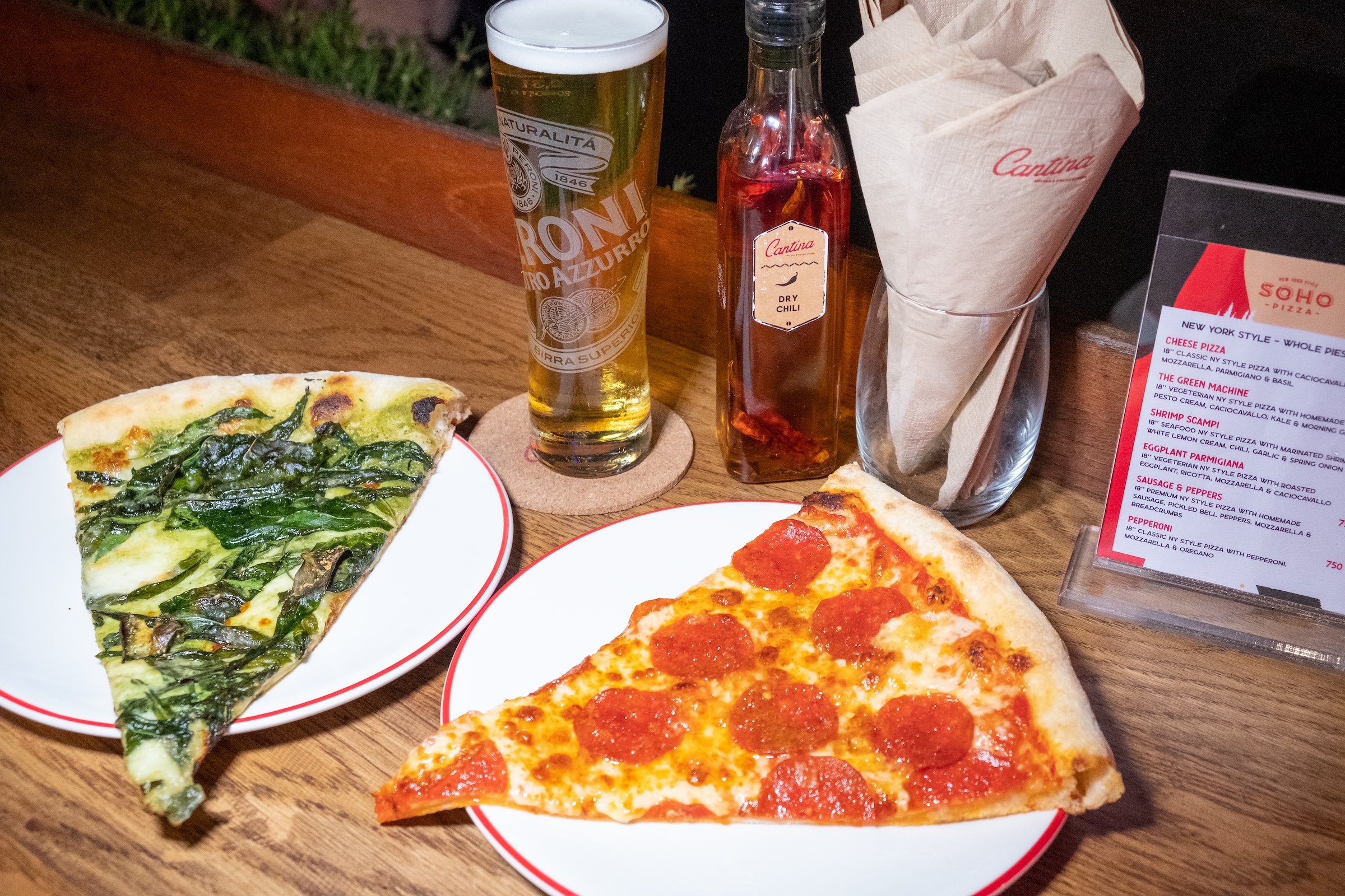 A concise menu offers six styles of pizza that can be ordered by-the-slice (or whole pie) at the alfresco standing area of the takeaway counter (Soho Pizza shares its pizza oven with next door sibling restaurant Cantina Pizzeria).