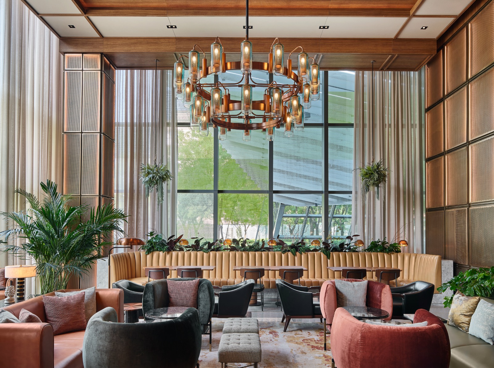 Occupying an expansive space with high ceilings, the interior encourages social engagements within a comfortably furnished decor that also showcases artworks, sculptures, and objets d’art. Natural timbers and full-height glass walls are highlighted with gleaming copper architectural frames, and metal mesh sheets. Take a seat at the dramatic main bar to engage with the bartenders, while for work, the adjacent long timber communal high tables fit the bill – and for relaxed socialising – well-spaced sofa and armchair settings flow seamlessly across from the main bar.