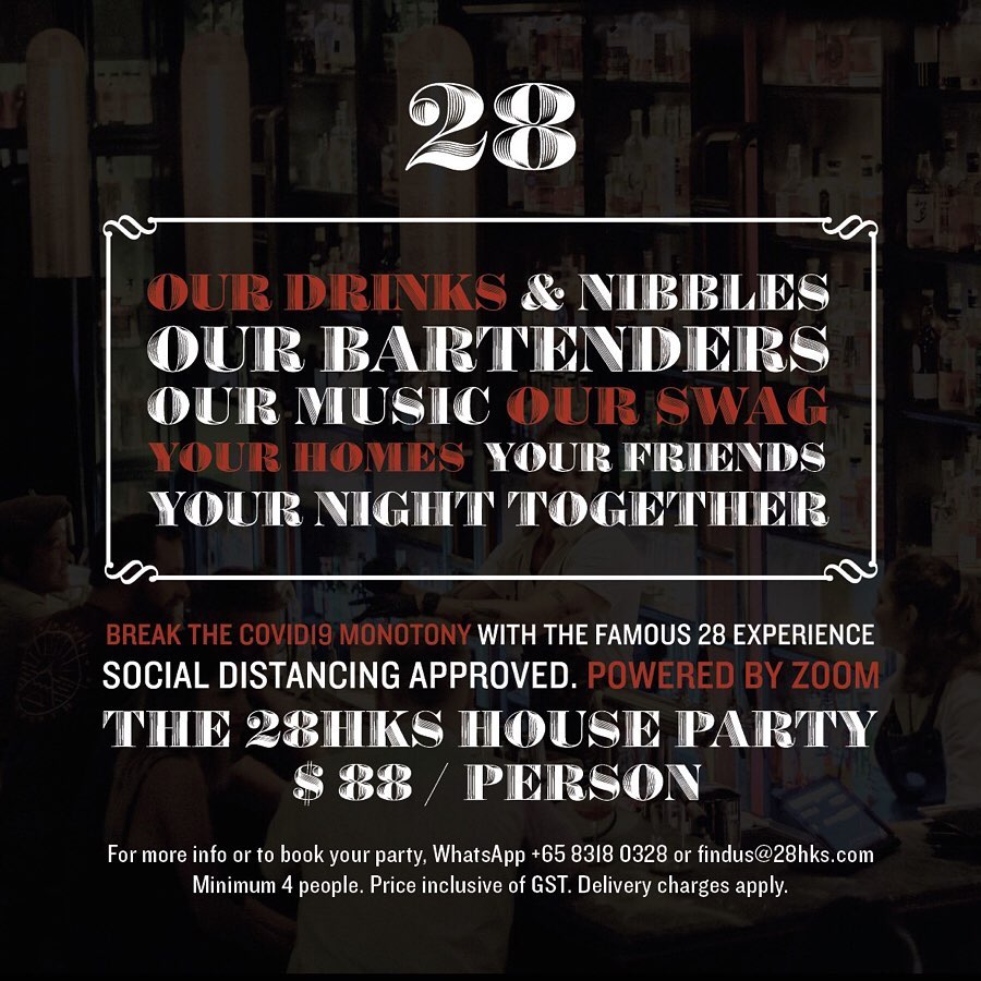 Legendary Singapore bar 28HKS have launched an innovative solution to alleviate the monotony and “cabin fever” experienced while living under social distancing restrictions. Introducing the 28HKS House Party – the bar team have pulled together an entertaining combination of selected signature cocktails, bar nibbles, house music, and “live” bartenders – delivered to your home via Zoom and courier.