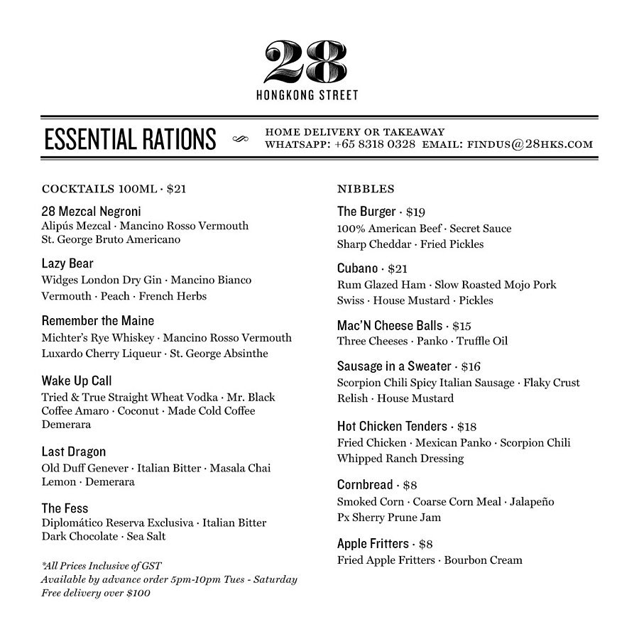 All offerings are available for takeaway or delivery (Singapore only) by advance order between 5 to 10 pm, Tuesday through Saturday via WhatsApp (+65 8318 0328) or email (findus@28hks.com).