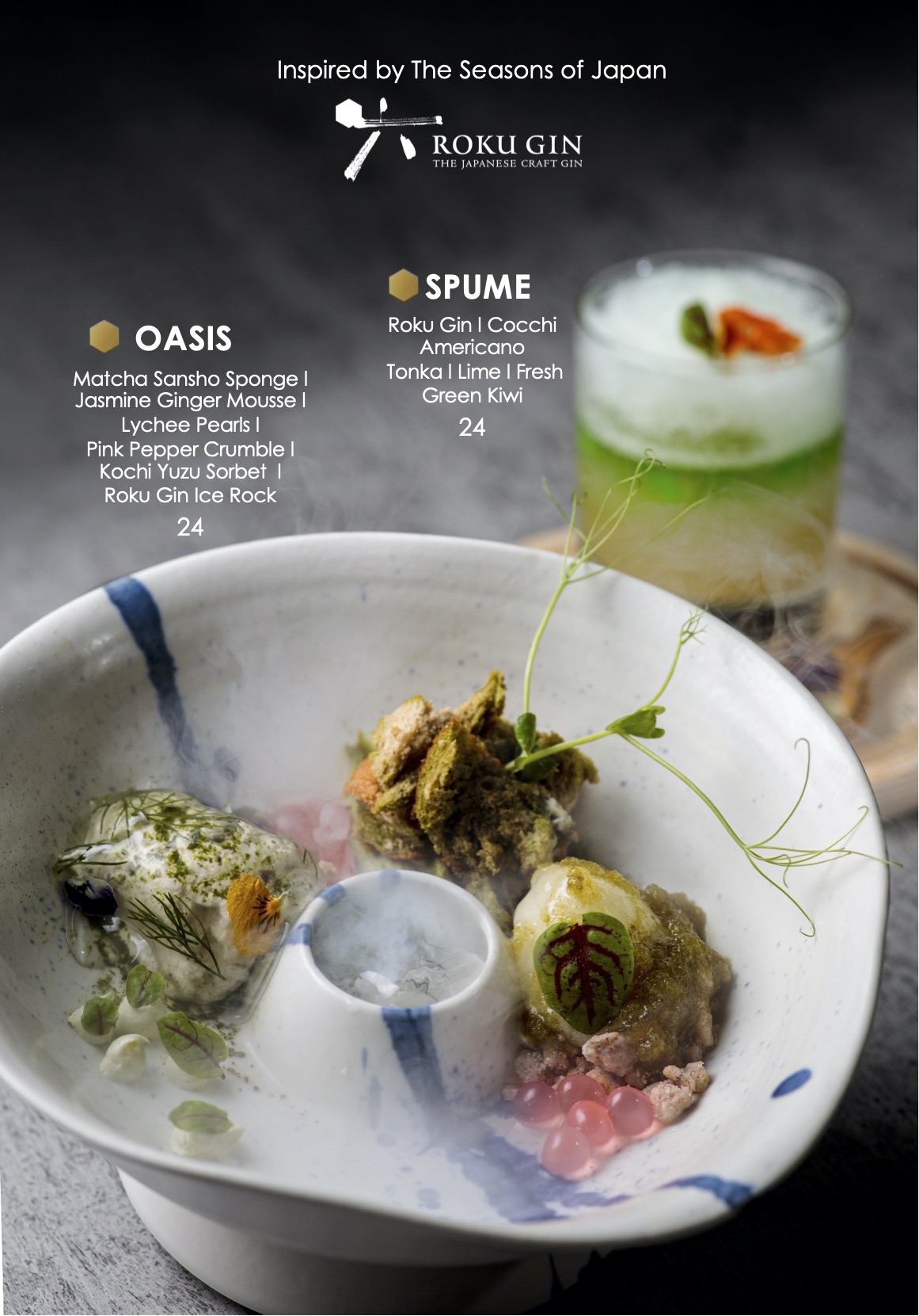 Complementing the Oasis dessert is the Spume cocktail – inspired by the unique flavors of Roku Gin. Combining Roku Gin, Cocchi Americano, the cocktail adds a taste of freshness from green kiwi with notes of lime, and is topped with a lingering scent of tonka bubbles.