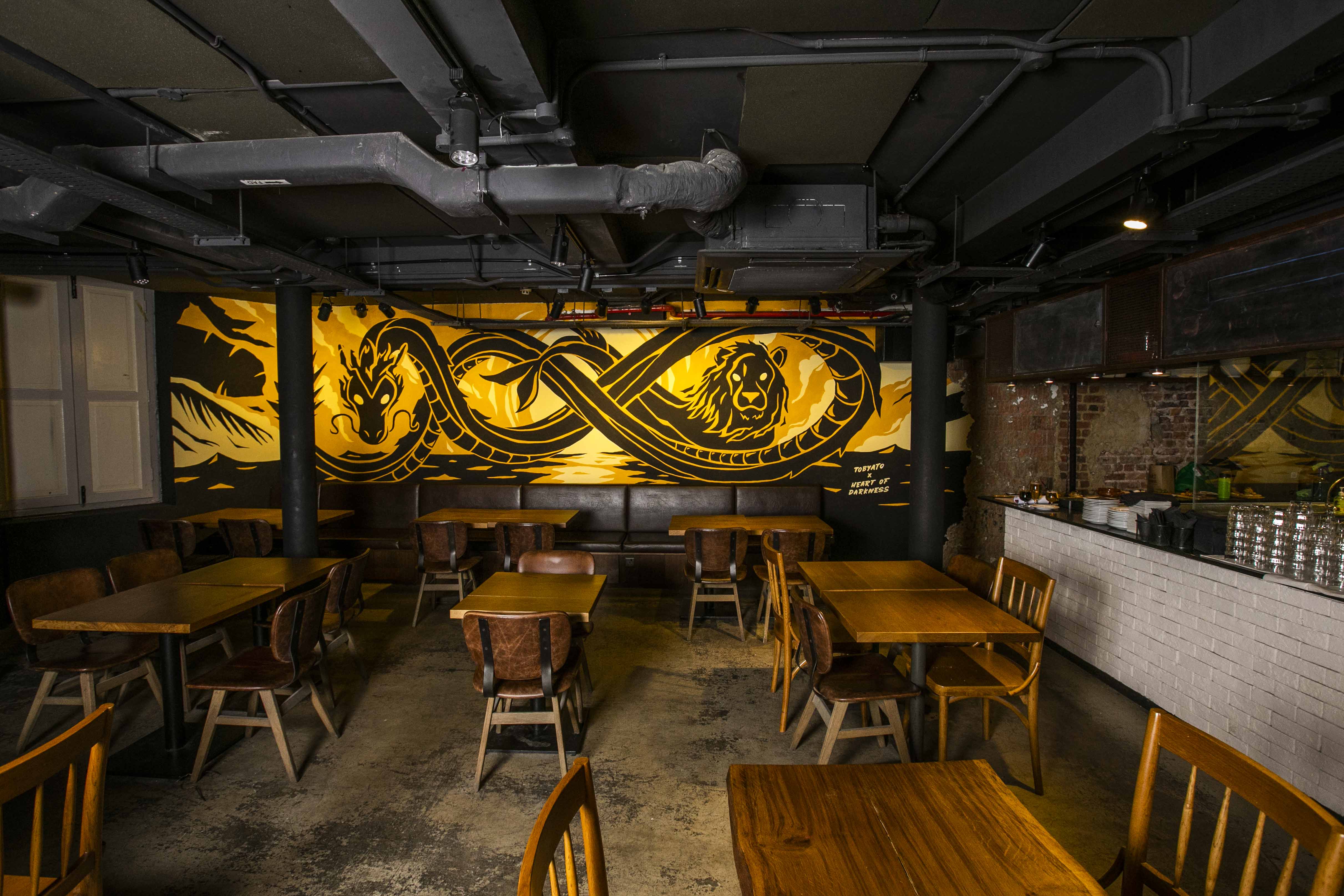 Featuring a rustic deco of concrete flooring, utilitarian timber furniture, and exposed raw brickwork, the interior is overlooked by a large mural across the back wall. Created by local visual artist Tobyato, the striking mural expresses the melding of Singapore and Vietnam cultures with an intertwined dragon and a Merlion set against a setting sun.