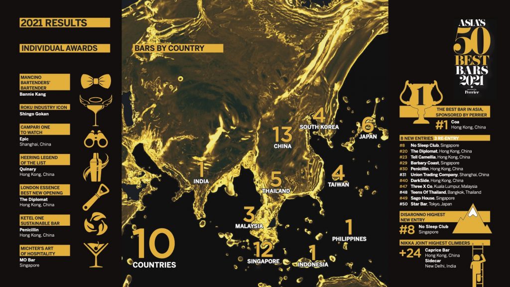 The 2021 list of Asia’s 50 Best Bars, sponsored by Perrier, was announced over a virtual awards ceremony on 6th May. Featuring bars from 10 countries in Asia, the sixth edition of the annual awards aims to recognize the immense talent, dedication, and resilience evident across Asia’s cocktail landscape. Given the devastating impact the global pandemic has had on the region’s bar scene, the awards look to inspire guests to return to bars through its lists and surrounding content programs.