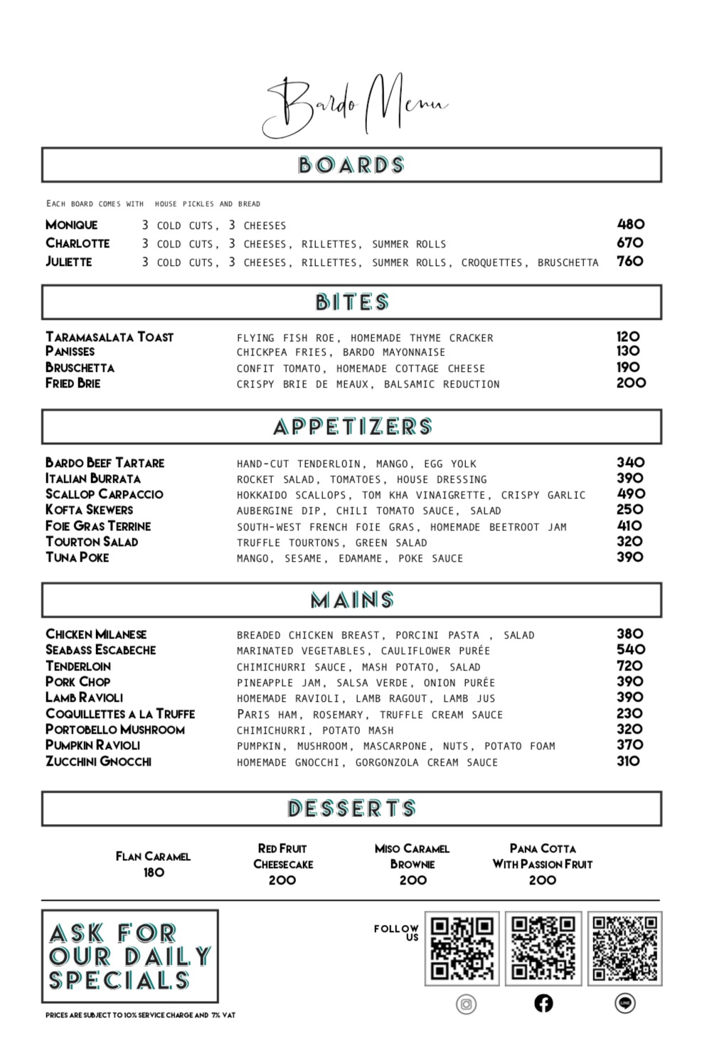 The culinary team at Bardo have created a concise yet varied menu of Mediterranean-inspired bistro dishes. Designed for sharing with friends and family, the modern take on classic French cuisine balances the flavors from various countries of the Mediterranean region – enhanced with fresh local ingredients. The menu offers selections of sharing boards and bites, appetizers, mains, and desserts – with daily specials and weekend brunch menus.