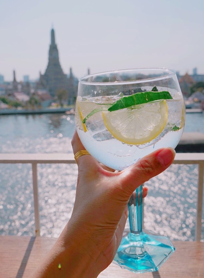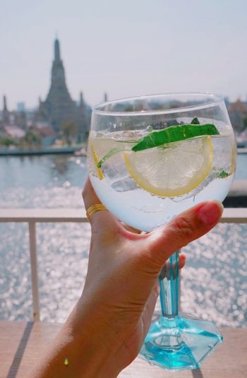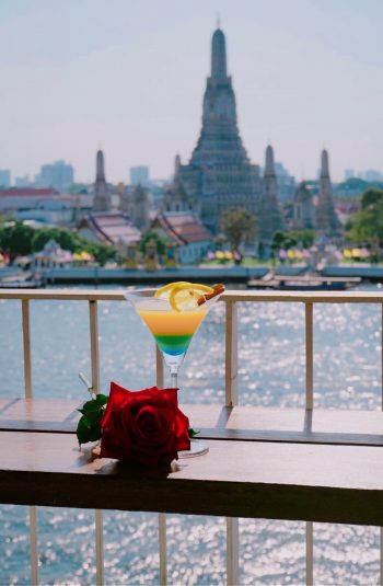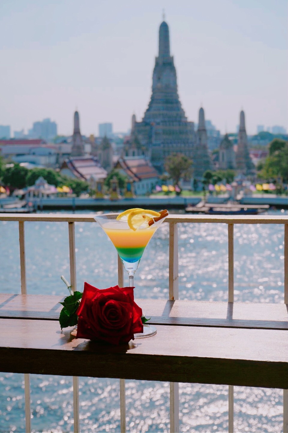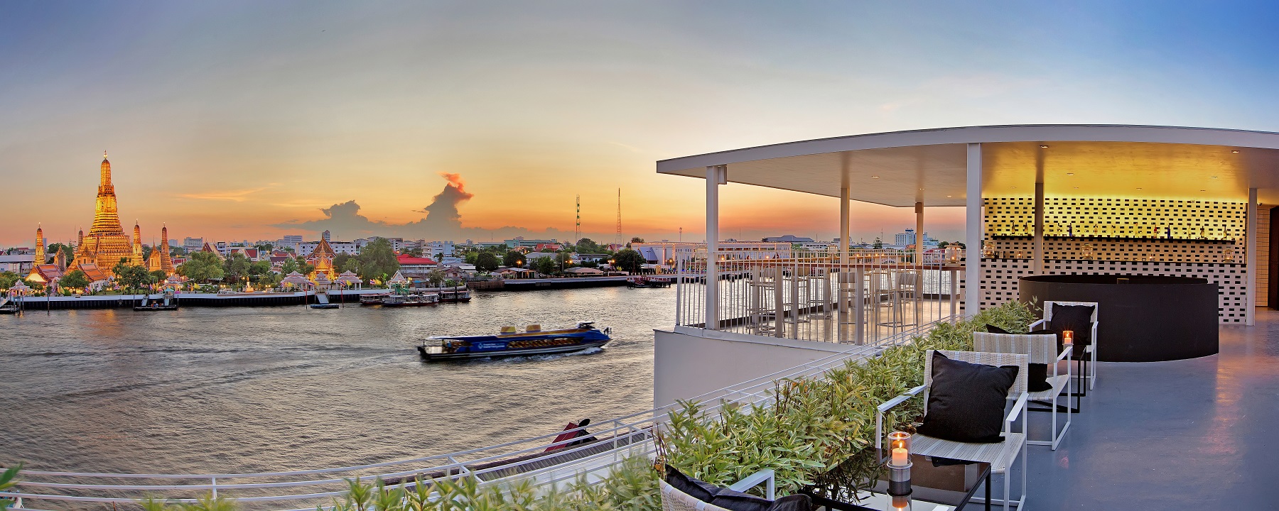 Waterfront bar with spectacular views across Chao Phraya River to Wat Arun