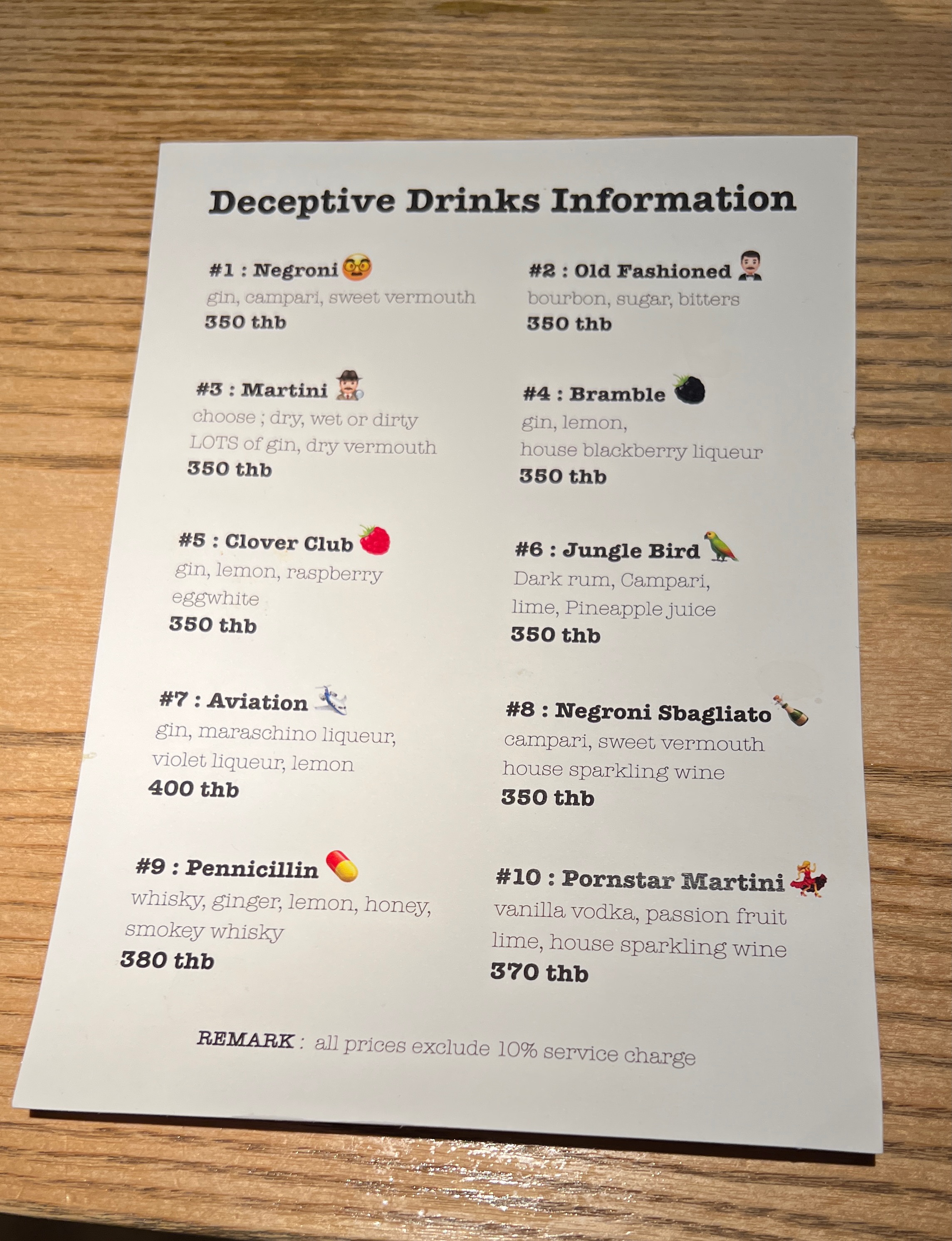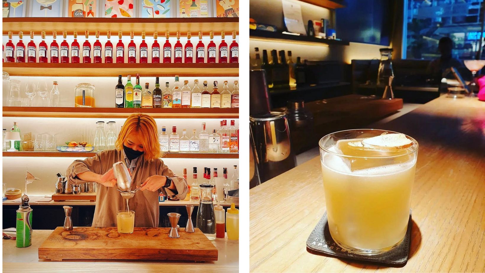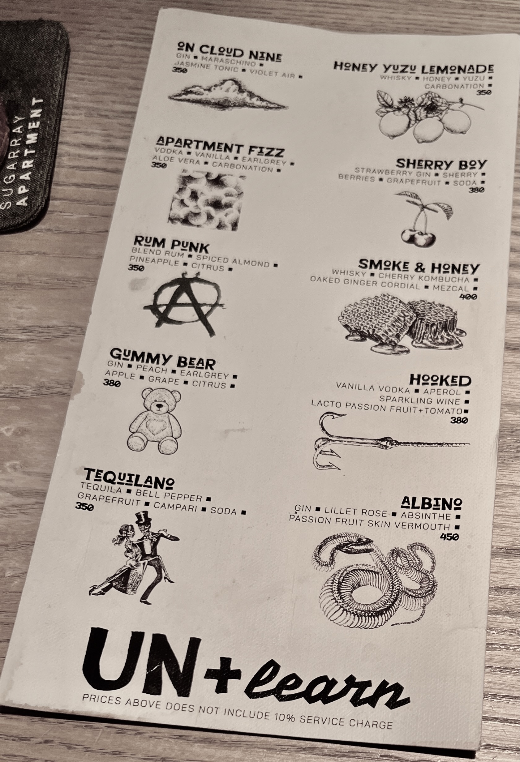 Signature cocktails are grouped under the list “UN + learn“ featuring 10 innovative creations such as Rum Punk – blend rum, spiced almond, pineapple, and citrus; Gummy Bear – gin, peach, earl grey, apple, grape, citrus; Smoke & Honey -whisky, cherry kombucha, mezcal, oaked ginger cordial; and Hooked – vanilla vodka, aperol, sparkling wine, lacto passion fruit, tomato. While 10 classic cocktails are listed as “Deceptive Drinks Information“ – examples include Negroni, Old Fashioned, Martini, and Clover Club. Cocktails are served in generous spirit-forward portions, with Japanese-style hand-carved ice, and house-made mixers.