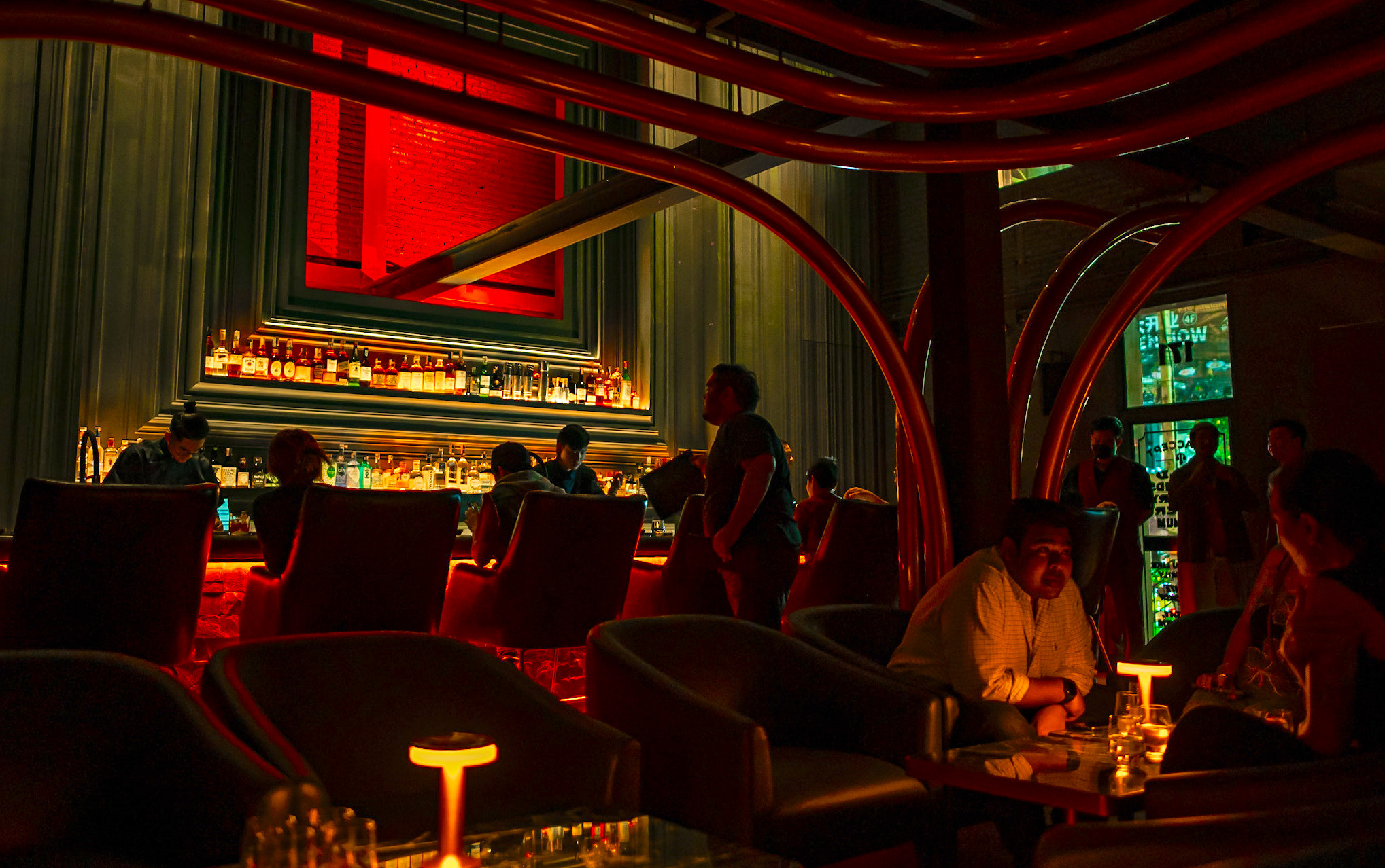 Moving inside the mock-pawnshop entrance – the bar opens out into a voluminous space with a series of seating zones replete with sofas and table settings – while the centerpiece cocktail bar counter is fronted with high-backed chairs.