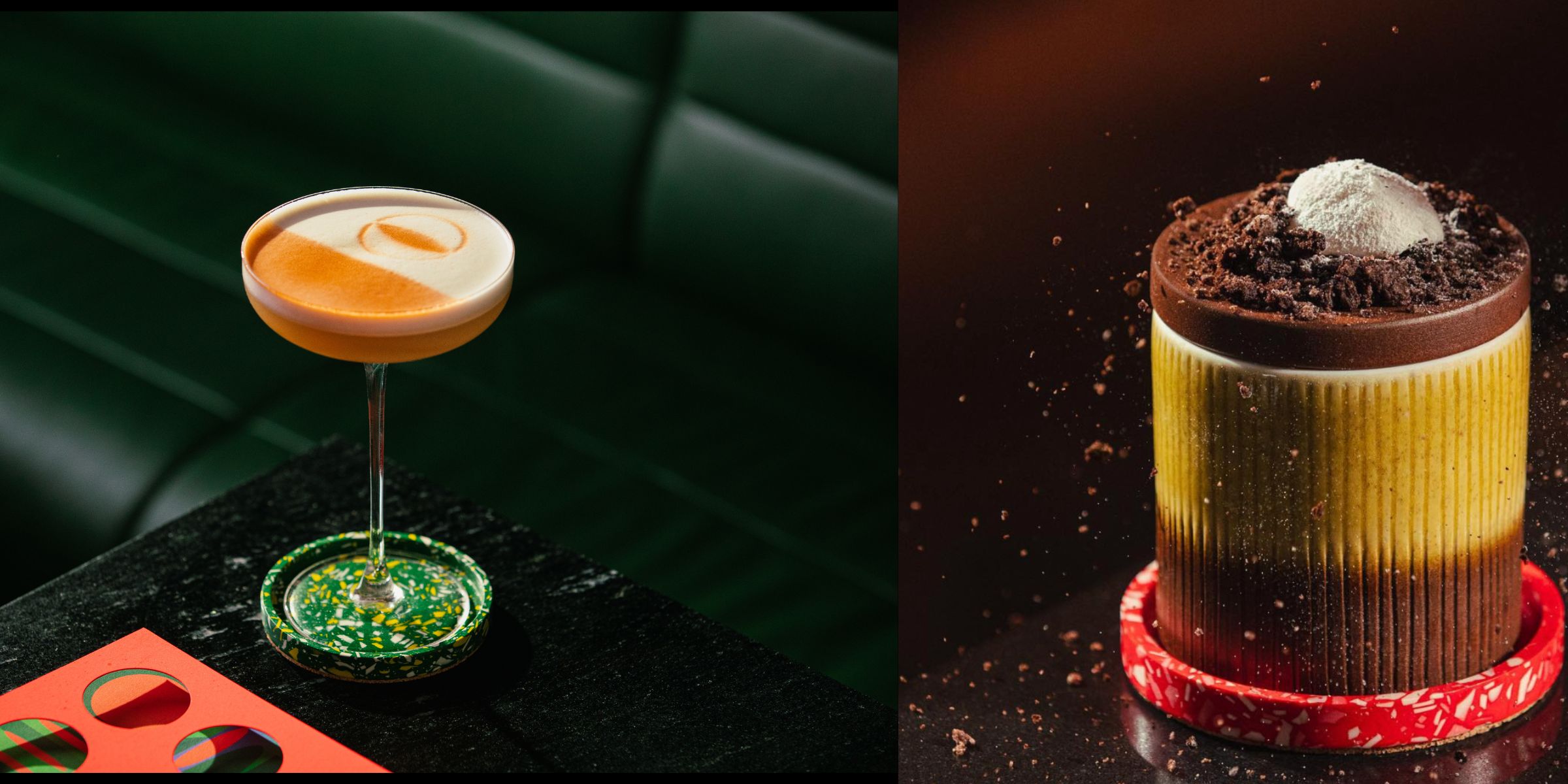 (L) View from the Treetops – Singapore dry gin, bianco vermouth, citrus, cacao, persimmon, black sesame.