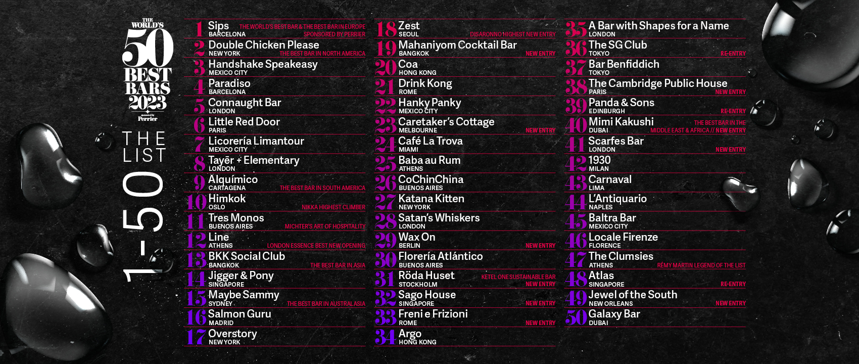 The World’s 50 Best Bars 2023 features establishments from 28 cities, with Barcelona’s Sips crowned The Best Bar in Europe and The World’s Best Bar, sponsored by Perrier. This is the second time a bar from Barcelona has taken the top spot in as many years, following Paradiso’s triumph in 2022.