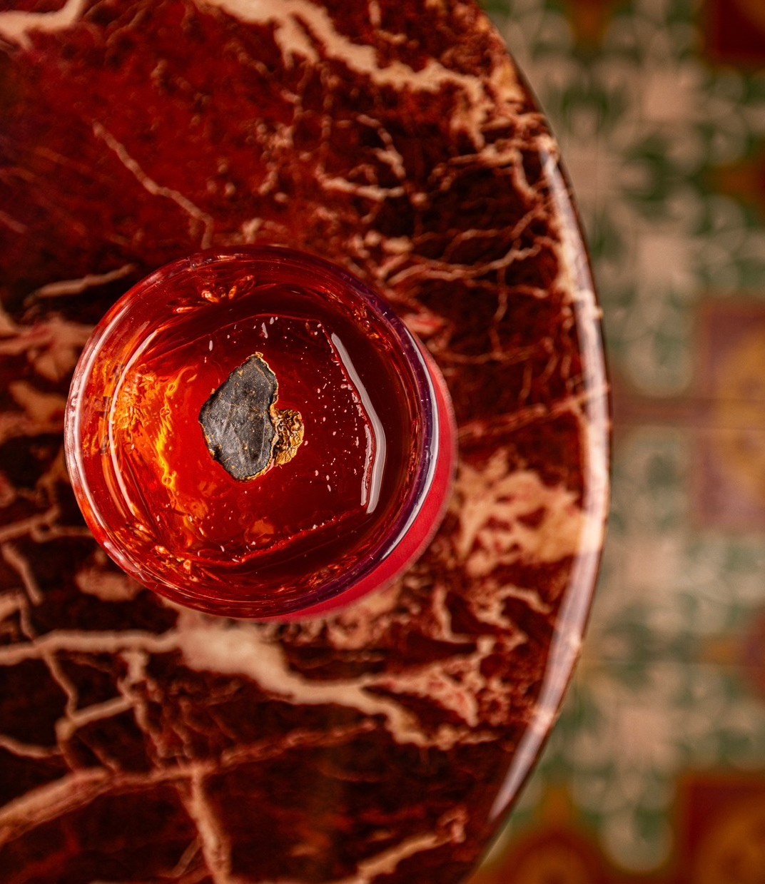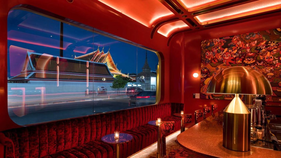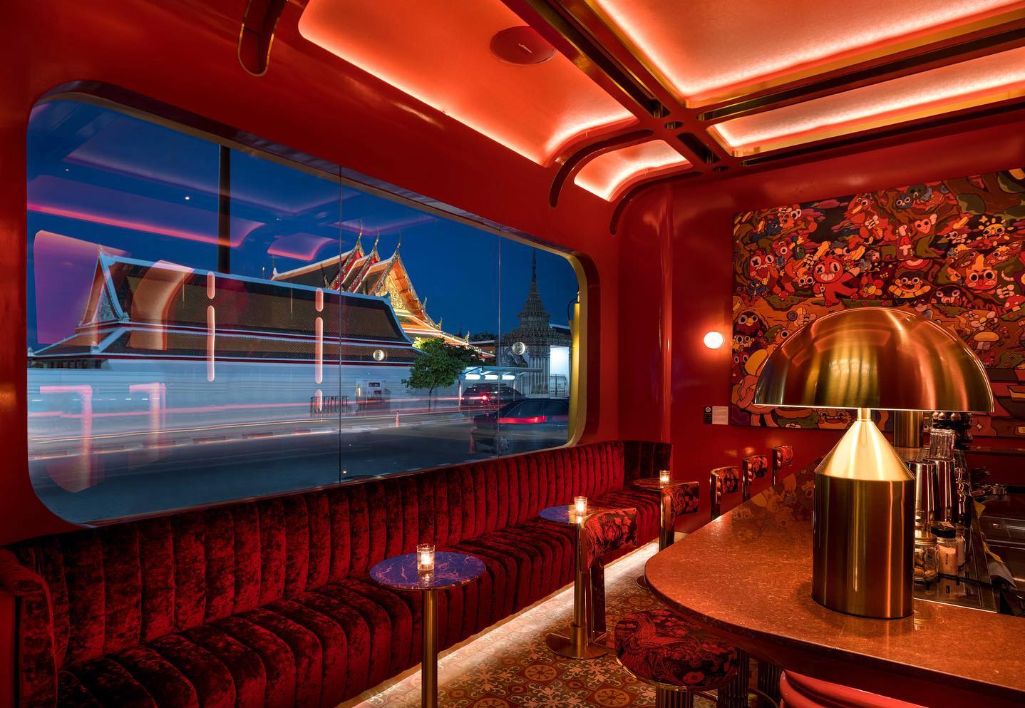 Occupying a compact space adjacent to the entrance of Nusara restaurant, Nuss Bar exudes a stylish luxe with its plush red velvet furnishings complementing the red-themed interior decor – and dramatic local artwork. Overlooking the renowned Wat Pho through a full-width portal-style window connects the bar with the Old Town neighborhood.
