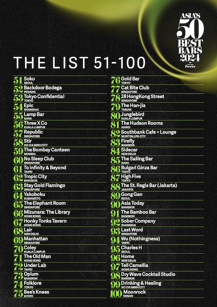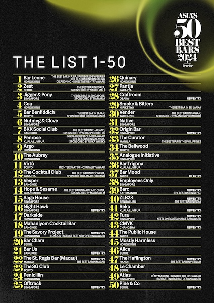 The top 5 bars for 2024 includes, in addition to No.1 Bar Leone – at No.2 intimate low-waste bar, Zest in Seoul, which has climbed three spots, making it The Best Bar in Korea. A consistent presence in the top five is Jigger & Pony in Singapore at No.3, making it The Best Bar in Singapore for the fifth year running. Last year’s top spot holder, Hong Kong bar Coa, came in at No.4; and at No.5 is Tokyo’s Bar Benfiddich, which took the title of The Best Bar in Japan.