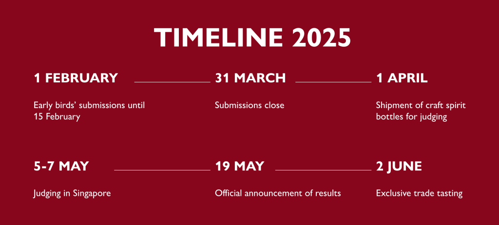 Entries will be judged in a blind-tasting format from 5-7 May 2025, with each judge tasting no more than 10 spirits per session, over a 120-minute seating. Spirits will be evaluated on a 120-point scale across the following key criteria: Aroma and Bouquet (20 points), Mouthfeel (20 points), Taste (20 points), Finish (20 points), and Overall Impression (20 points).