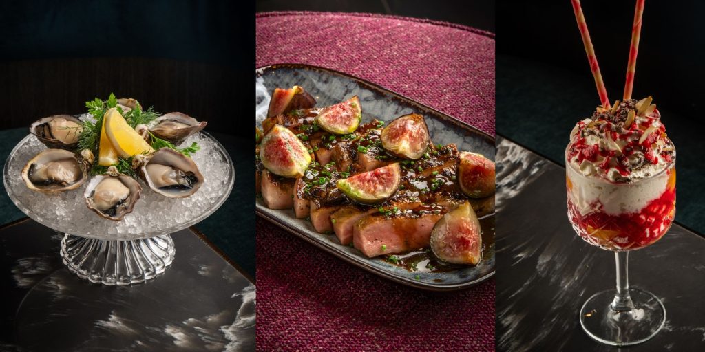 (L-R: Japanese Oysters / Iberico Pork Secreto & Fig Vincotto / Peach Melba, Tahitian Vanilla Gelato, Marshmallow )