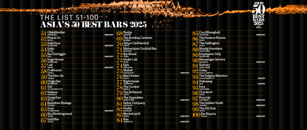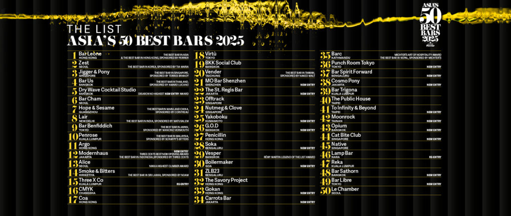 At No.2 is the sustainability-forward Zest in Seoul, a position it retains from 2024, making it The Best Bar in Korea, sponsored by Tia Maria, for the third year running. Another consistent presence in the top five is the plush drinking den Jigger & Pony in Singapore at No.3, making it The Best Bar in Singapore, sponsored by Torres Brandy, for the sixth consecutive year. Climbing 17 places to No.4 is Bar Us in Bangkok which takes the title of The Best Bar in Thailand, sponsored by Amaro Lucano. A newcomer to the list, Dry Wave Cocktail Studio, also from Bangkok, debuts at an impressive No.5 while clinching the Disaronno Highest New Entry Award.