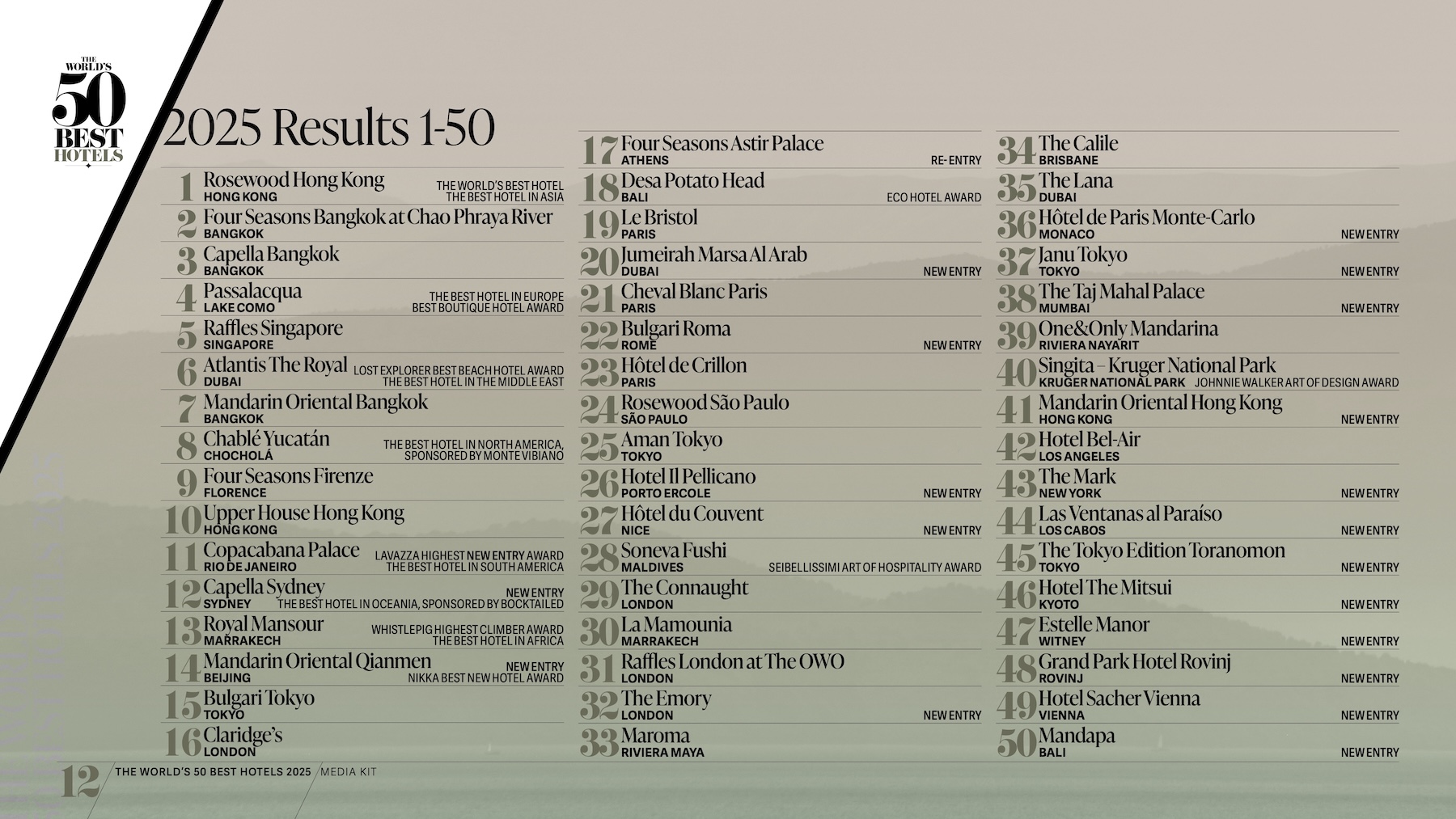THE LIST OF THE WORLD’S 50 BEST HOTELS 2025